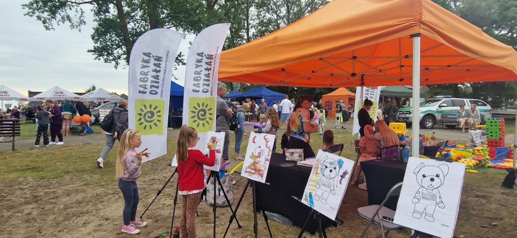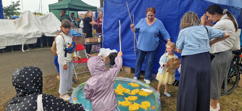 Wokół trwało mnostwo animacji plenerowych, także w morskich klimatach: malowanie rybek na sklejkach, które prowadziły Panie ze świetlic gminnych, łowienie rybek w basenie z naszymi wspaniałymi paniami z Biblioteka Publiczna Gminy Sztutowo, malowanie buziek, warkoczyki, bańki, kącik plastyczny i balonowe warsztaty – wszystko to tętniło radością i dziecięcym śmiechem.