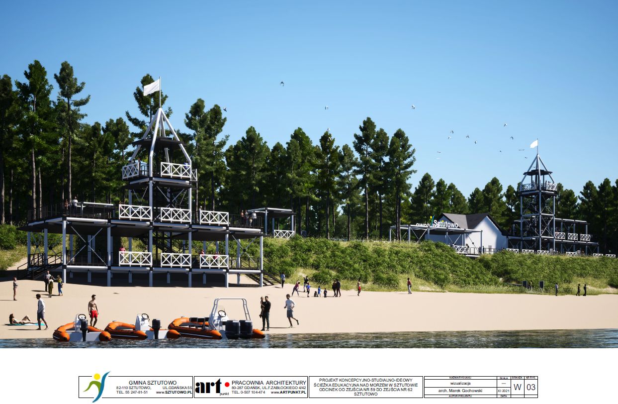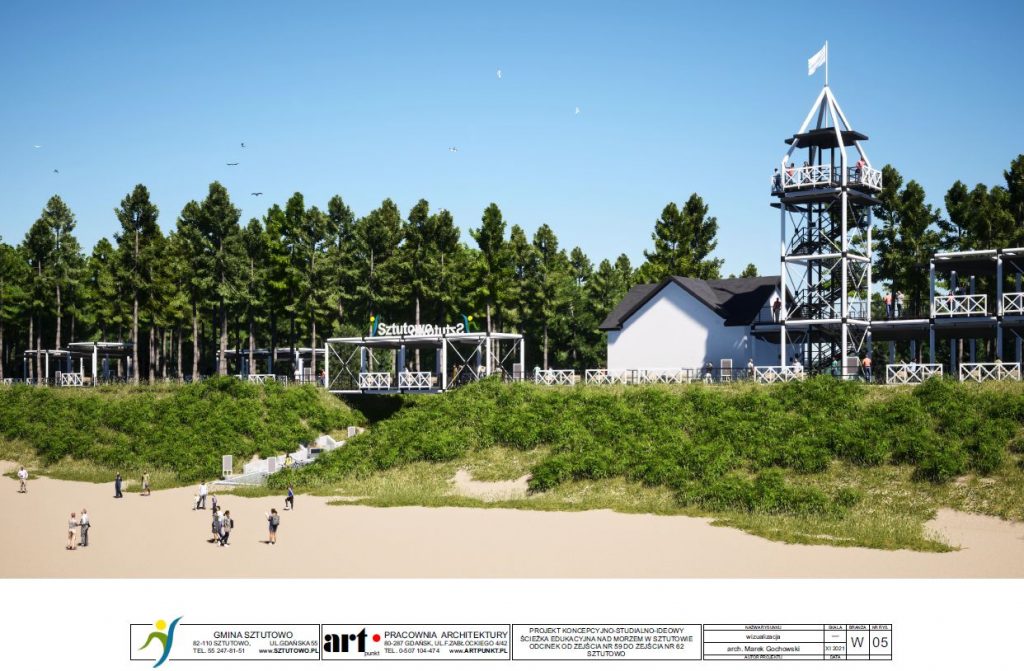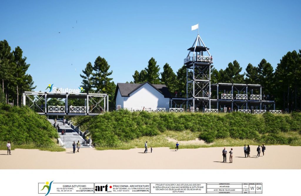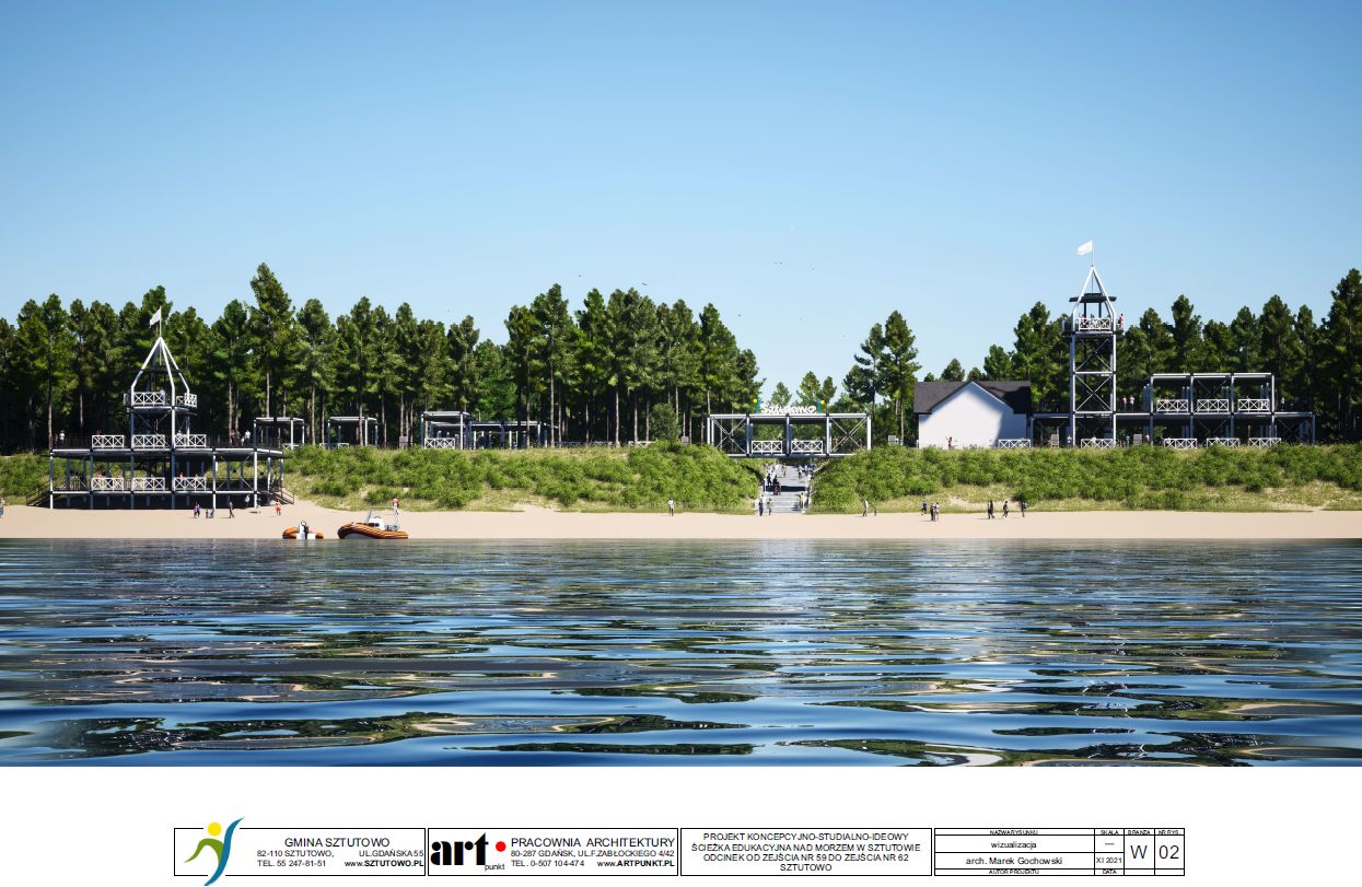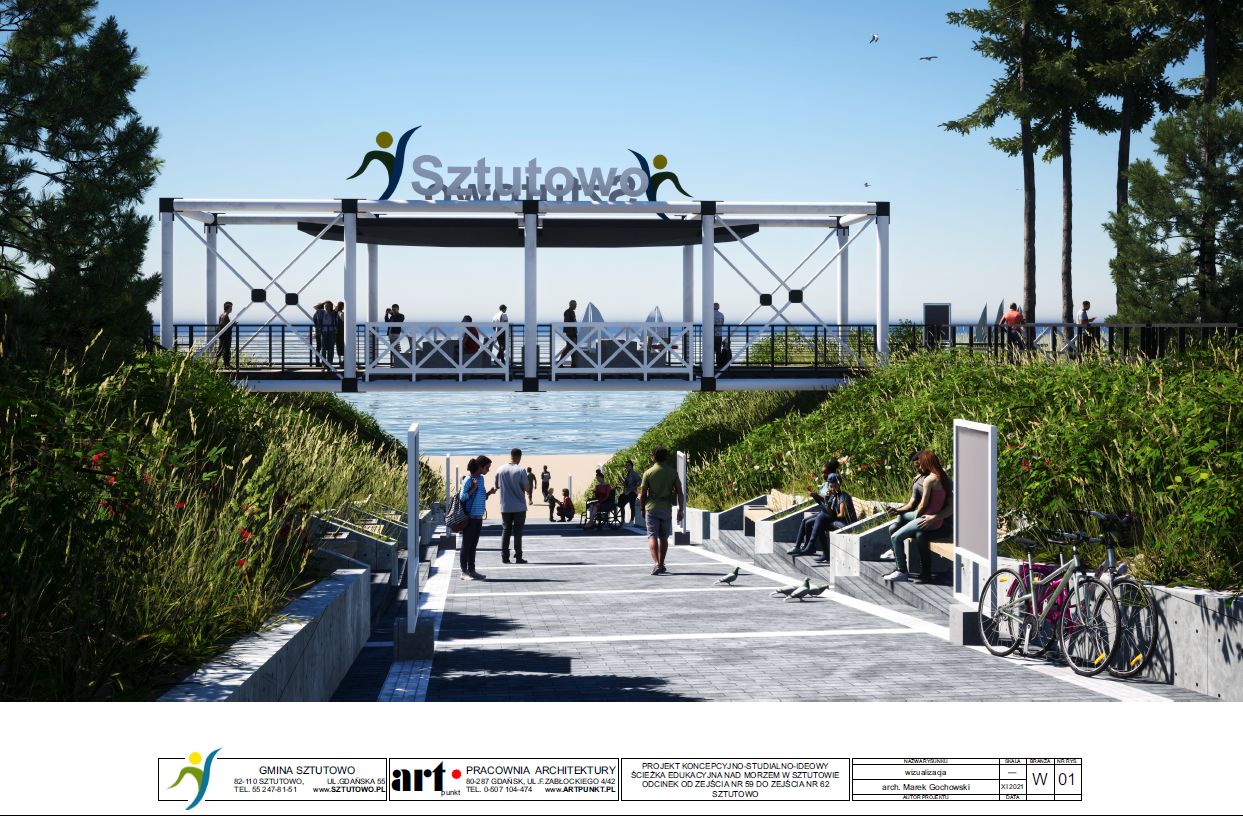 Ścieżka edukacyjna nad morzem w Sztutowie, prowadząca od zejścia 59 do 62 zakłada min. powstanie terenów usługowych, terenów rekreacyjnych, taras widokowo- usługowy, pasaż edukacyjno – rekreacyjny w lesie.