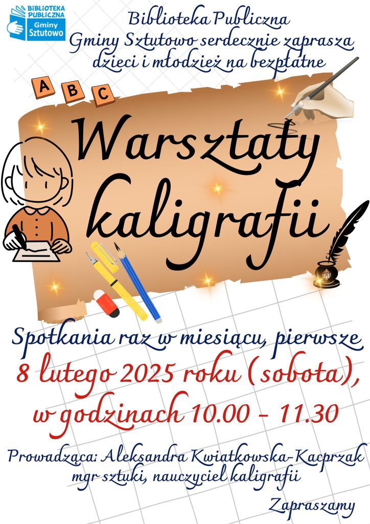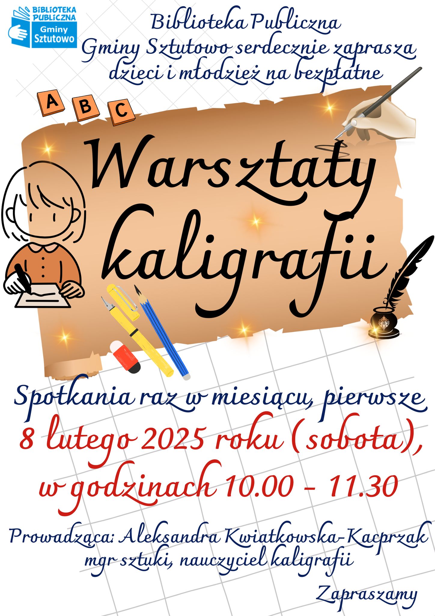 Strona główna » Aktualności » Ruszają warsztaty kaligrafii – od 8 lutego Data dodania 06.02.2025 Ruszają warsztaty kaligrafii – od 8 lutego Serdecznie zapraszamy na cykl warsztatów z kaligrafii, które odbywać się będą raz w miesiącu. Pierwsze spotkanie już 8 lutego 2025r. w godz. 10:00-11:30. Zajęcia prowadzi Pani Aleksandra Kwiatkowska-Kacprzak – mgr sztuki, nauczyciel kaligrafii. Drukuj