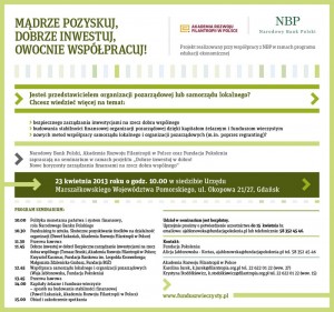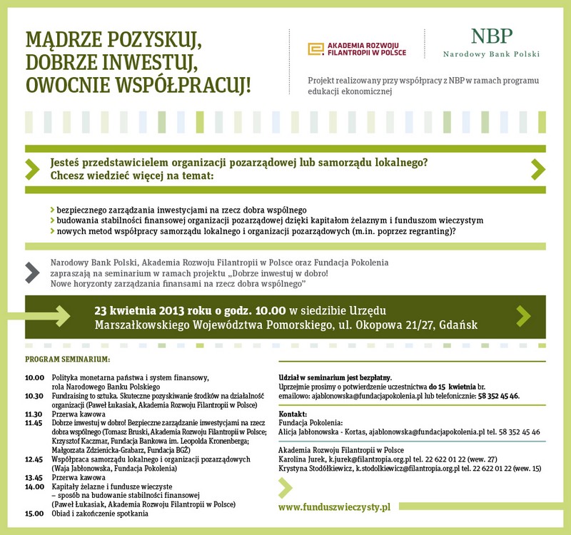 Narodowy Bank Polski, Akademia Rozwoju Filantropii w Polsce oraz Fundacja Pokolenia mają zaszczyt zaprosić przedstawicieli organizacji pozarządowych oraz samorządów lokalnych na Seminarium regionalne „Mądrze pozyskuj, dobrze inwestuj, owocnie współpracuj!” w ramach projektu „Dobrze inwestuj w dobro! Nowe horyzonty zarządzania finansami na rzecz dobra wspólnego”, które odbędzie się w dniu 23 kwietnia 2013 roku o godz. 10.00 Urząd Marszałkowski Województwa Pomorskiego, ul. Okopowa 21/27 Gdańsk