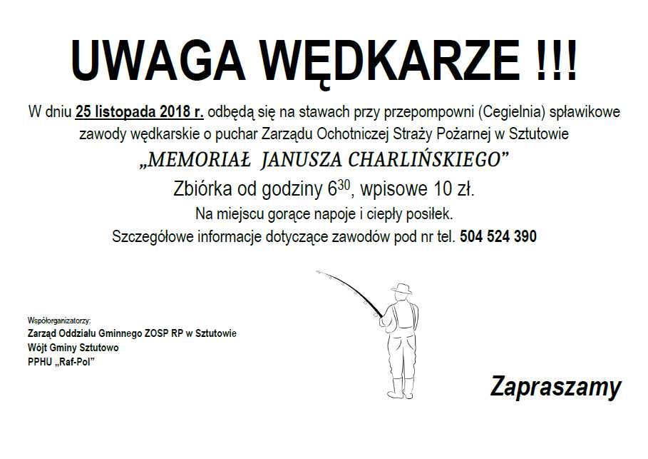 Wójt Gminy Sztutowo oraz strażacy z OSP Sztutowo zapraszają na spławikowe zawody wędkarskie o puchar Zarządu Ochotniczej Straży Pożarnej w Sztutowie „MEMORIAŁ JANUSZA CHARLIŃSKIEGO”. Szczegóły na plakacie: