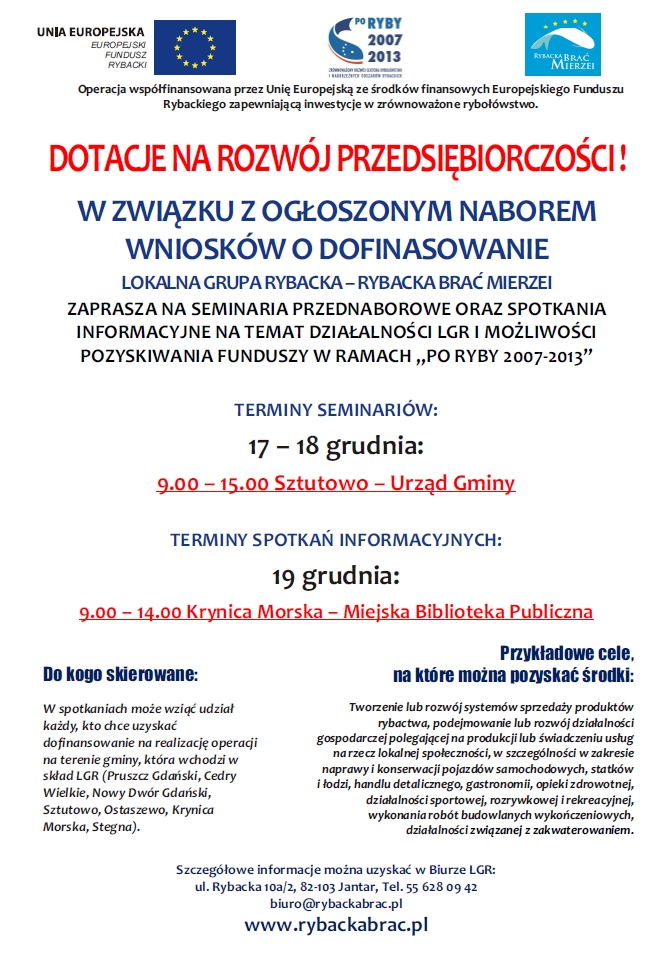 Strona główna » Aktualności » Spotkania informacyjne Lokalnej Grupy Rybackiej Data dodania 26.11.2012 Spotkania informacyjne Lokalnej Grupy Rybackiej Drukuj