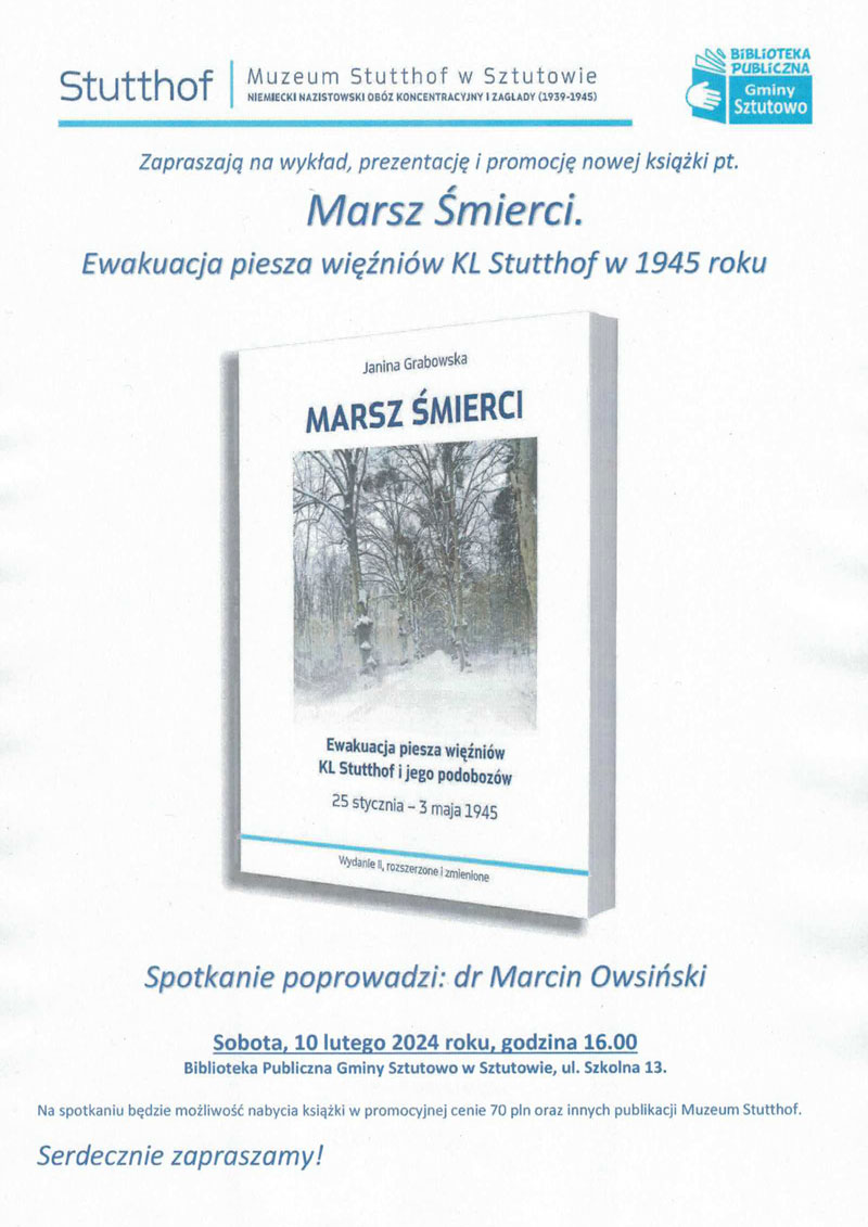 Serdecznie zapraszamy Państwa na spotkanie autorskie oraz prezentację najnowszej książki Pani Janiny Grabowskiej pt. Marsz śmierci”, które poprowadzi dla Państwa dr Marcin Owsiński.