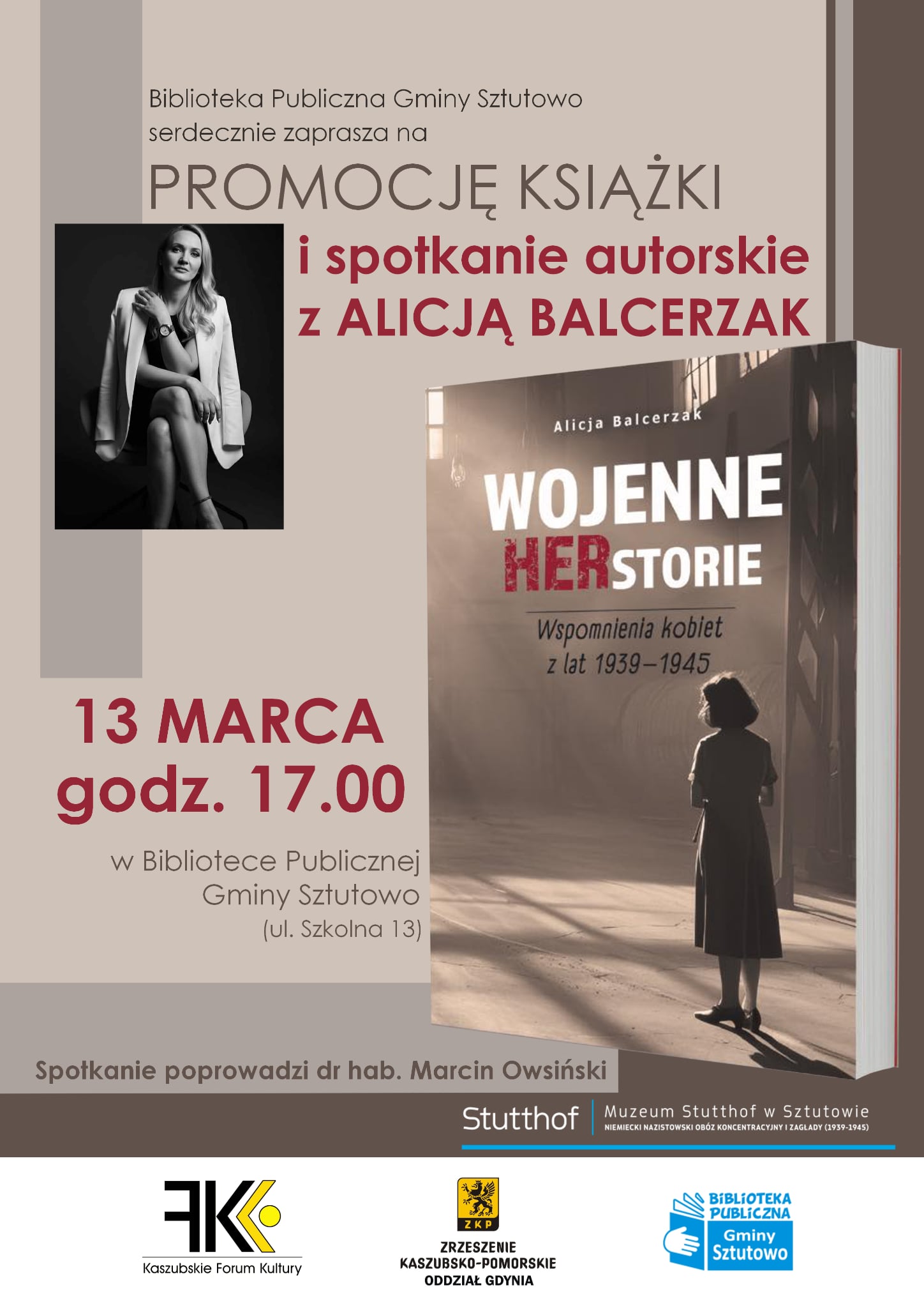 W imieniu Biblioteki Publicznej Gminy Sztutowo serdecznie zapraszamy na spotkanie z Alicją Balcerzak, autorką poruszającej książki „Wojenne HERstorie. Wspomnienia kobiet z lat 1939–1945”.