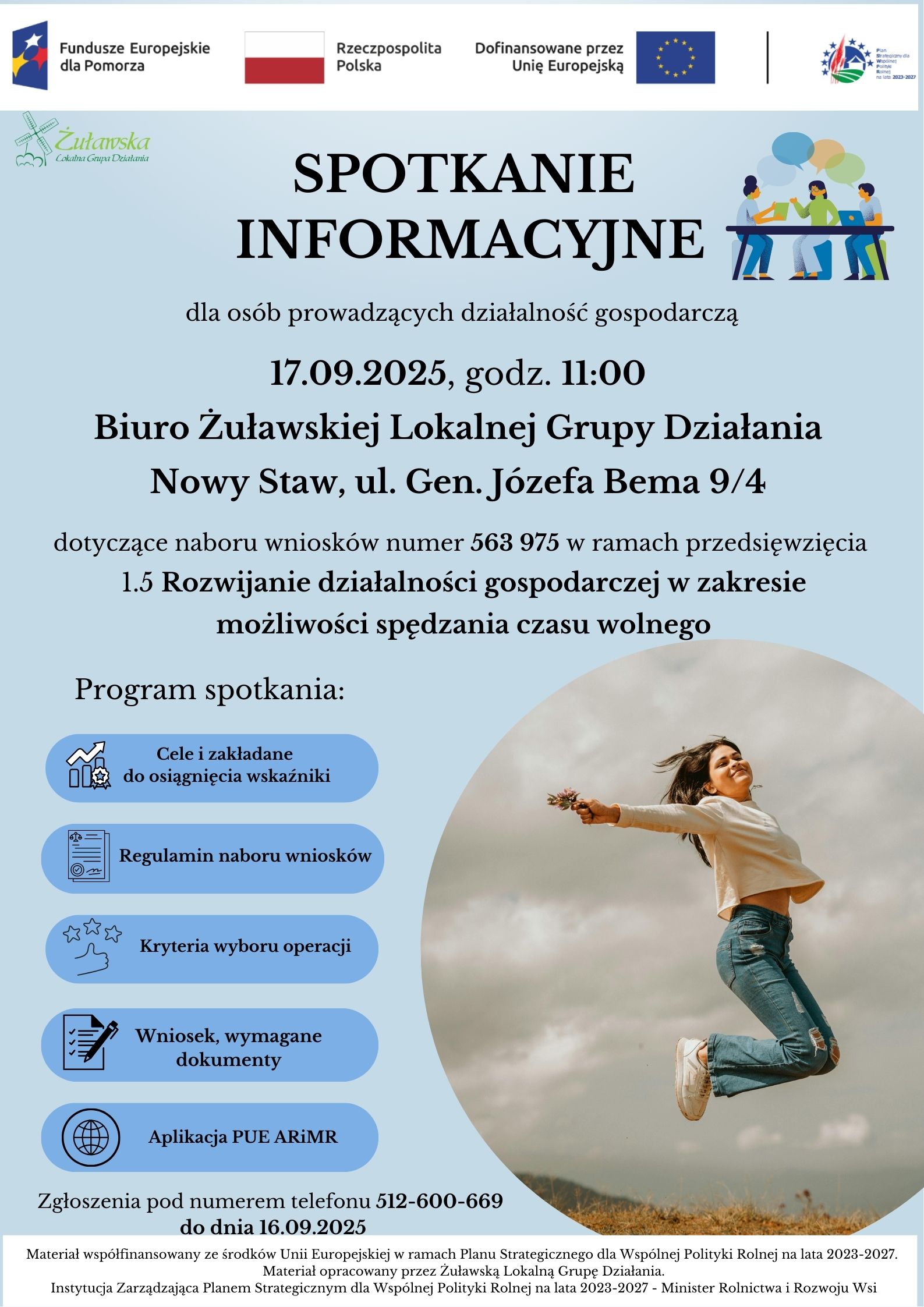 17.09.2025, godz. 11:00, Biuro Żuławskiej Lokalnej Grupy Działania, Nowy Staw, ul. Gen. Józefa Bema 9/4: dotyczące naboru wniosków numer 563 975 w ramach przedsięwzięcia 1.5 „Rozwijanie działalności gospodarczej w zakresie możliwości spędzania czasu wolnego”.