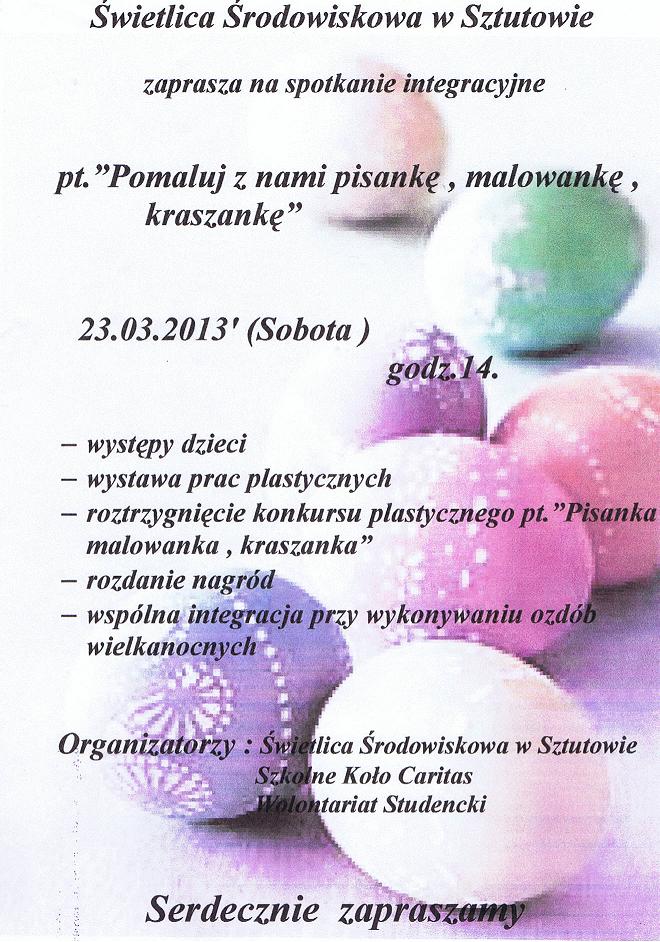 Strona główna » Aktualności » Spotkanie integracyjne: „Pomaluj z nami pisankę, malowankę, kraszankę” Data dodania 18.03.2013 Spotkanie integracyjne: „Pomaluj z nami pisankę, malowankę, kraszankę” Drukuj