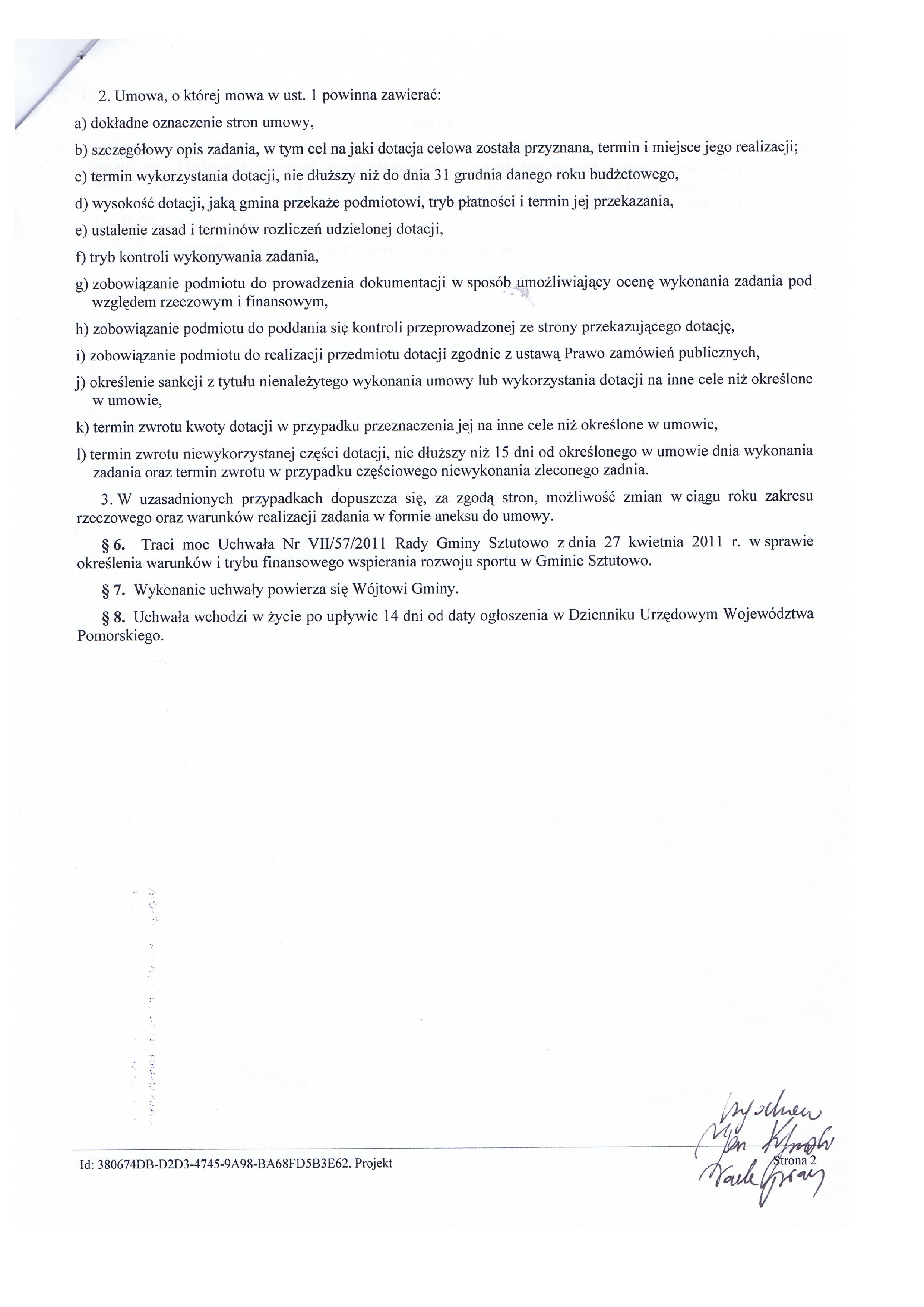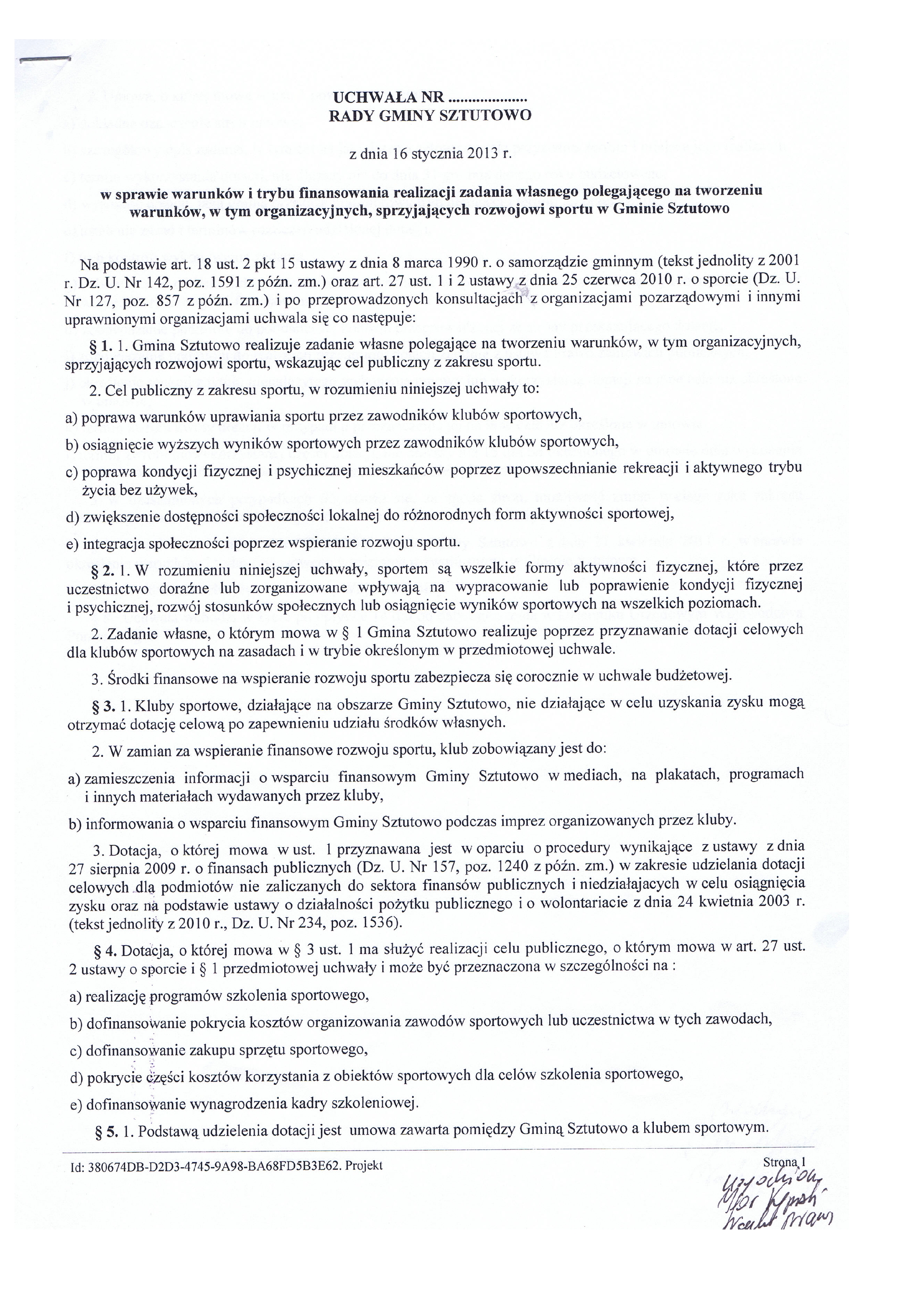 W dniu 13 lutego 2013 roku o godz. 10:00 w budynku Urzędu Gminy w Sztutowie, pokój nr 16 odbędzie się spotkanie konsultacyjne, którego przedmiotem jest projekt uchwały w sprawie warunków i trybu finansowania realizacji zadania własnego polegającego na tworzeniu warunków, w tym organizacyjnych, sprzyjających rozwojowi sportu w Gminie Sztutowo.