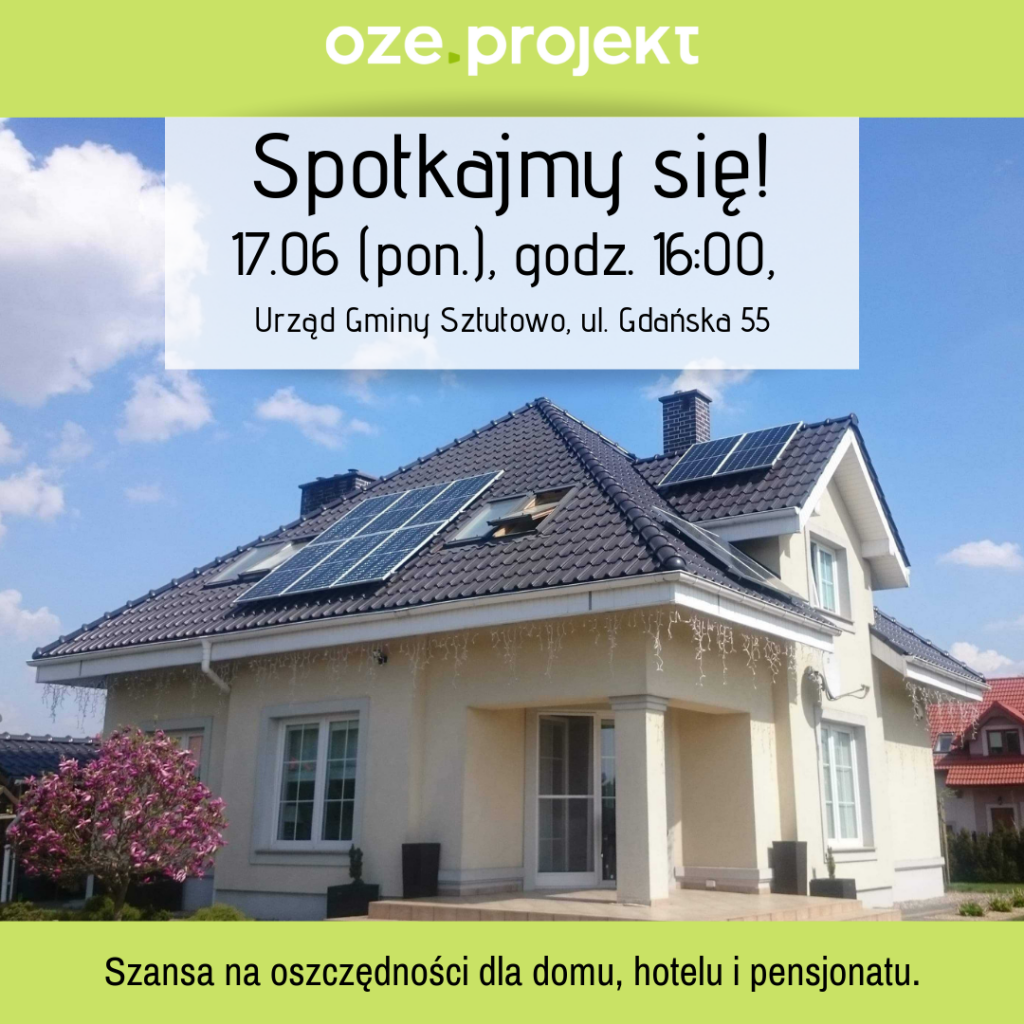Zapraszamy mieszkańców zainteresowanych budową instalacji fotowoltaicznych, a tym samym obniżeniem rachunków za prąd i produkcją własnej energii elektrycznej, na spotkanie z przedstawicielami firmy OZE Projekt Fotowoltaika w najbliższy poniedziałek 17 czerwca o godzinie 16:00 w Urzędzie Gminy w Sztutowie.