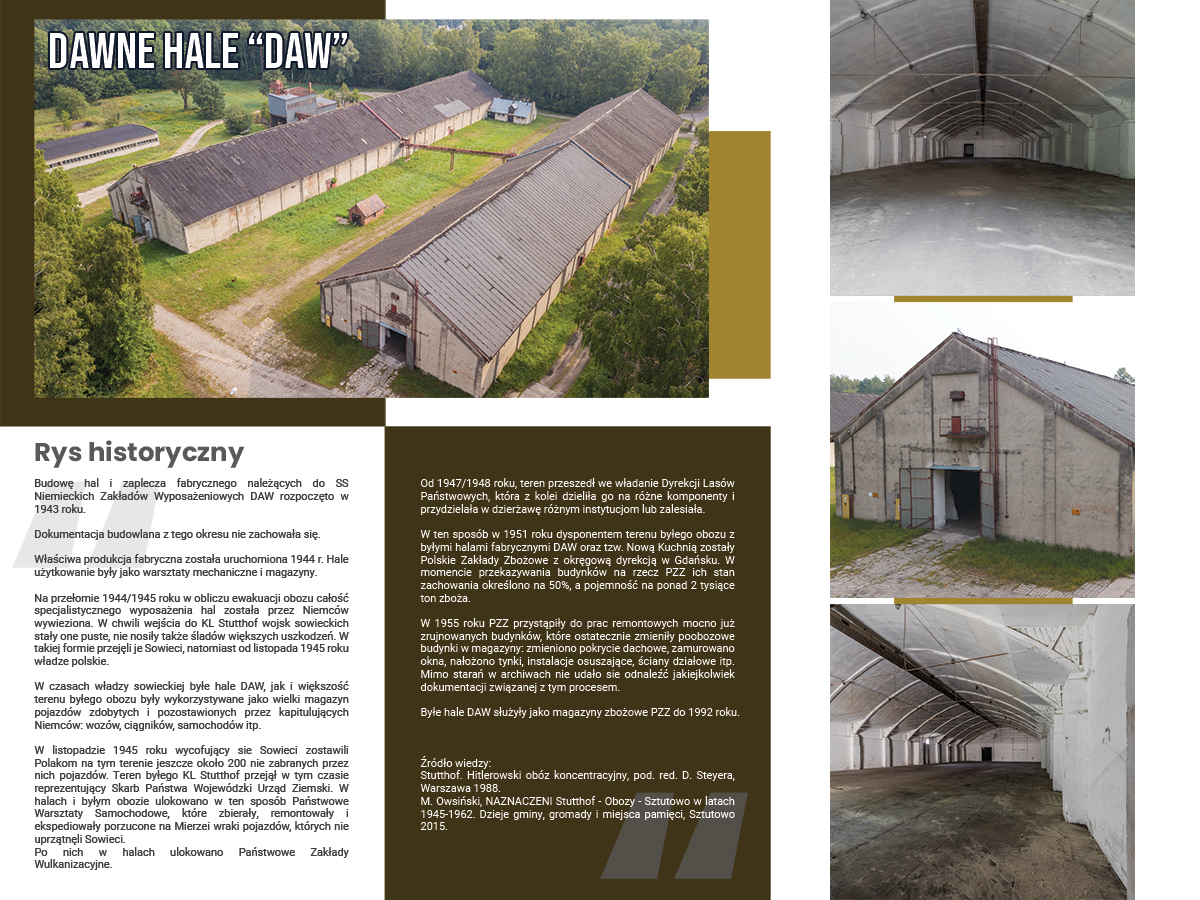 23 listopada 2021 r. w Urzędzie Gminy w Sztutowie z inicjatywy i na zaproszenie Wójta Gminy Sztutowo odbyło się spotkanie poświęcone możliwości przekazania i zaadaptowania zabytkowych hal magazynowych (dawne hale zbrojeniowe DAW), na potrzeby utworzenia Centralnej Składnicy Muzealnej. W ramach przypomnienia informujemy, że hale magazynowe są własnością Gminy Sztutowo, natomiast ich położenie w Stefie Ochronnej Pomnika Zagłady, którym jest zespół byłego niemieckiego nazistowskiego obozu koncentracyjnego i zagłady Stutthof, stwarza duże ograniczenia w rozporządzaniu nieruchomością.