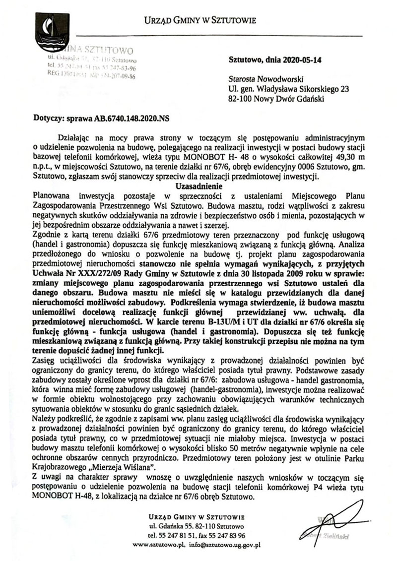 Informujemy, że Wójt Gminy Sztutowo, współdziałając z Radnymi i mieszkańcami Sztutowa, na mocy prawa strony w postępowaniu, złożył do Starosty Nowodworskiego sprzeciw dla realizacji inwestycji polegającej na budowie stacji bazowej telefonii komórkowej, na terenie działki 67/6 (ul. Morska w Sztutowie).