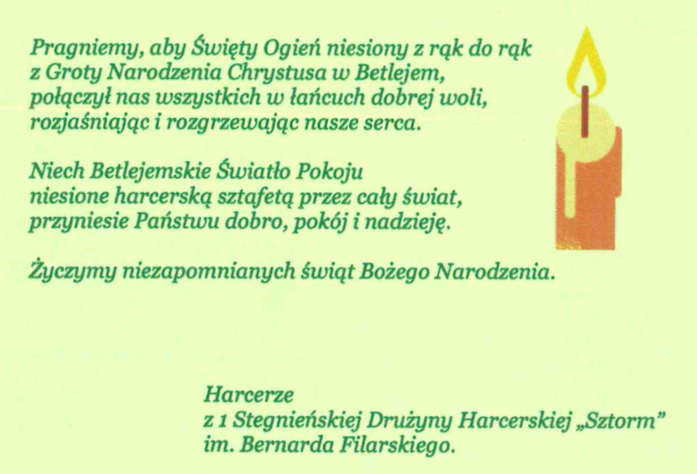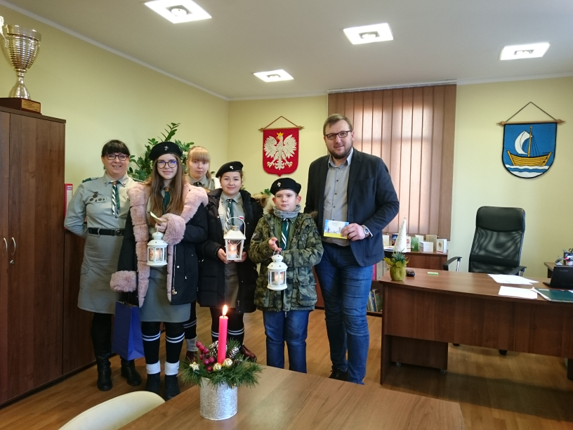 Rozpoczął się czas składania życzeń i przygotowań do zbliżających się Świąt Bożego Narodzenia. Dziś z Betlejemskim Światłem Pokoju i tegorocznym hasłem: Światło, które daje moc… odwiedziły nas dwie grupy: harcerze z 1 Stegieńskiej Drużyny Harcerskiej „Sztorm” im. Bernarda Filarskiego oraz dzieci i młodzież ze Świetlicy w Sztutowie wraz z opiekunką Aliną Niedzielską. Grupa ze Sztutowa odwiedza dziś wszystkie instytucje naszej gminy z podarkami i niespodziankami.