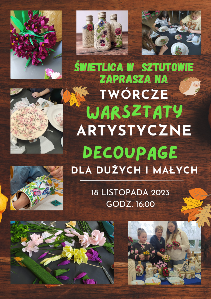 Strona główna » Aktualności » Świetlica w Sztutowie zaprasza na twórcze warsztaty decoupage Data dodania 08.11.2023 Świetlica w Sztutowie zaprasza na twórcze warsztaty decoupage Drukuj