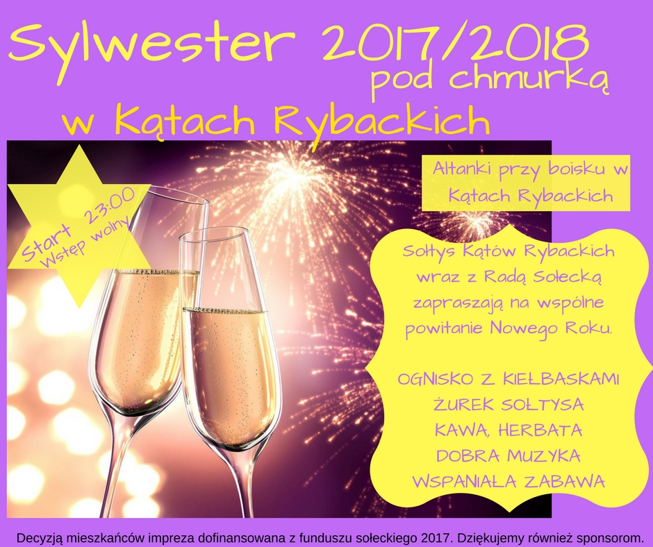 Sołtys Kątów Rybackich wraz z Radą Sołecką zapraszają na wspólne powitanie Nowego Roku. Sylwester pod chmurką odbędzie się w Altankach przy boisku w Kątach Rybackich.