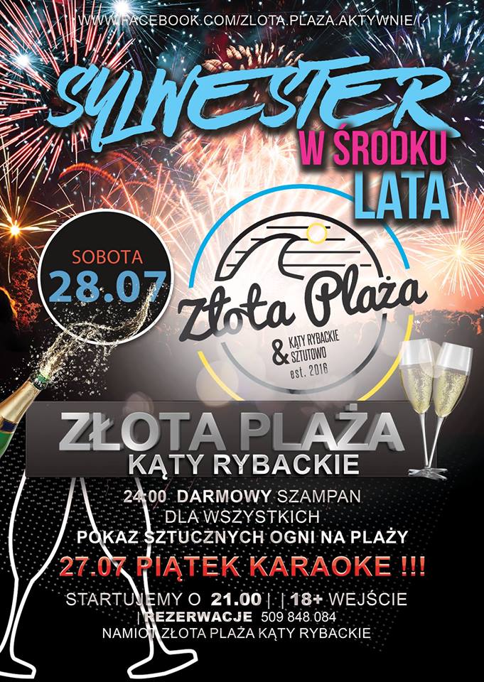 Strona główna » Aktualności » Sylwester w środku lata – Złota Plaża w Kątach Rybackich 28.07.2018 r. Data dodania 25.07.2018 Sylwester w środku lata – Złota Plaża w Kątach Rybackich 28.07.2018 r. Drukuj