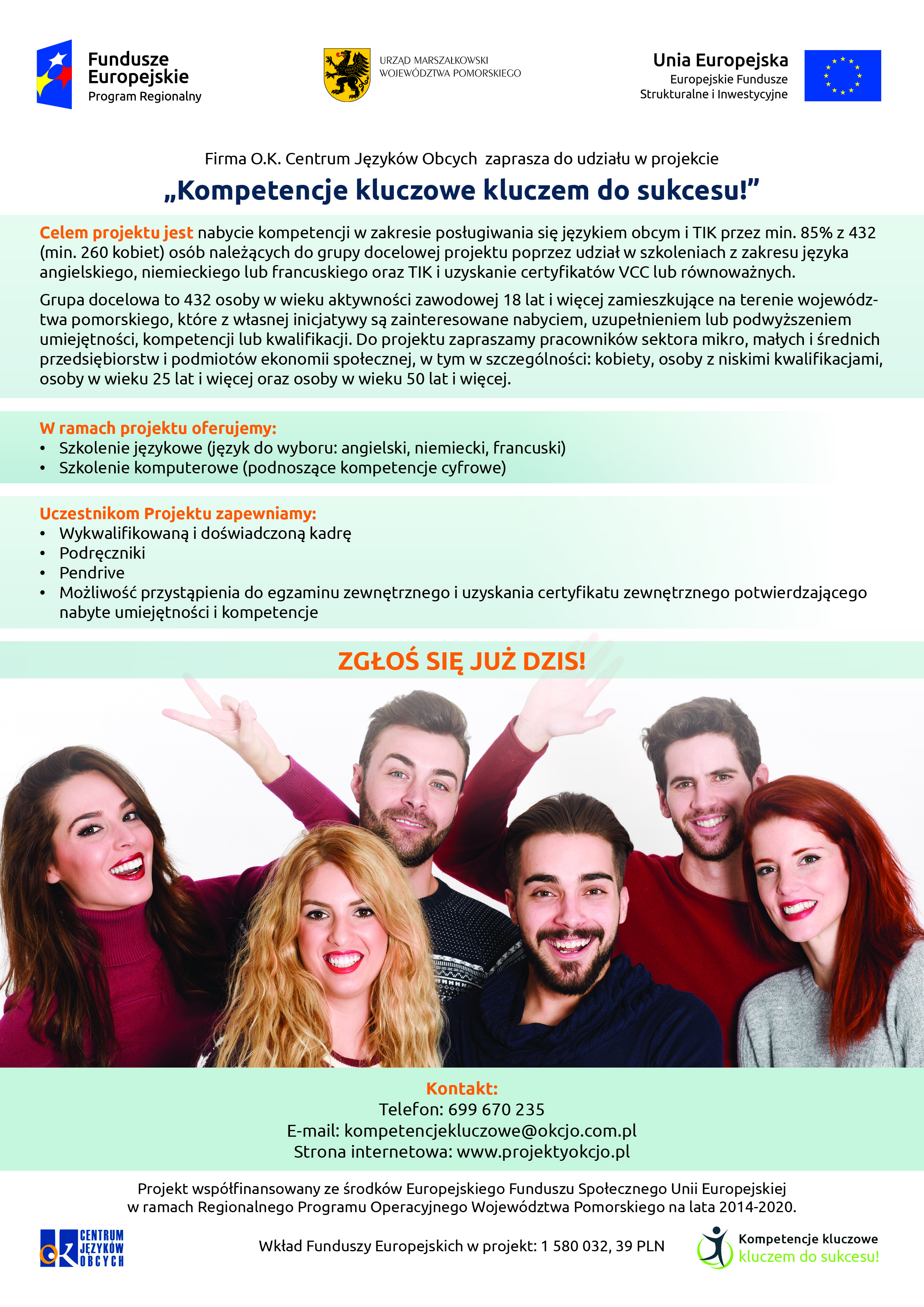Firma O.K. Centrum Języków Obcych zaprasza do udziału w projekcie “Kompetencje kluczowe kluczem do sukcesu!”. W ramach projektu firma oferuje szkolenia językowe (do wyboru: angielski, niemiecki, francuski) oraz szkolenie komputerowe (podnoszące kompetencje cyfrowe).