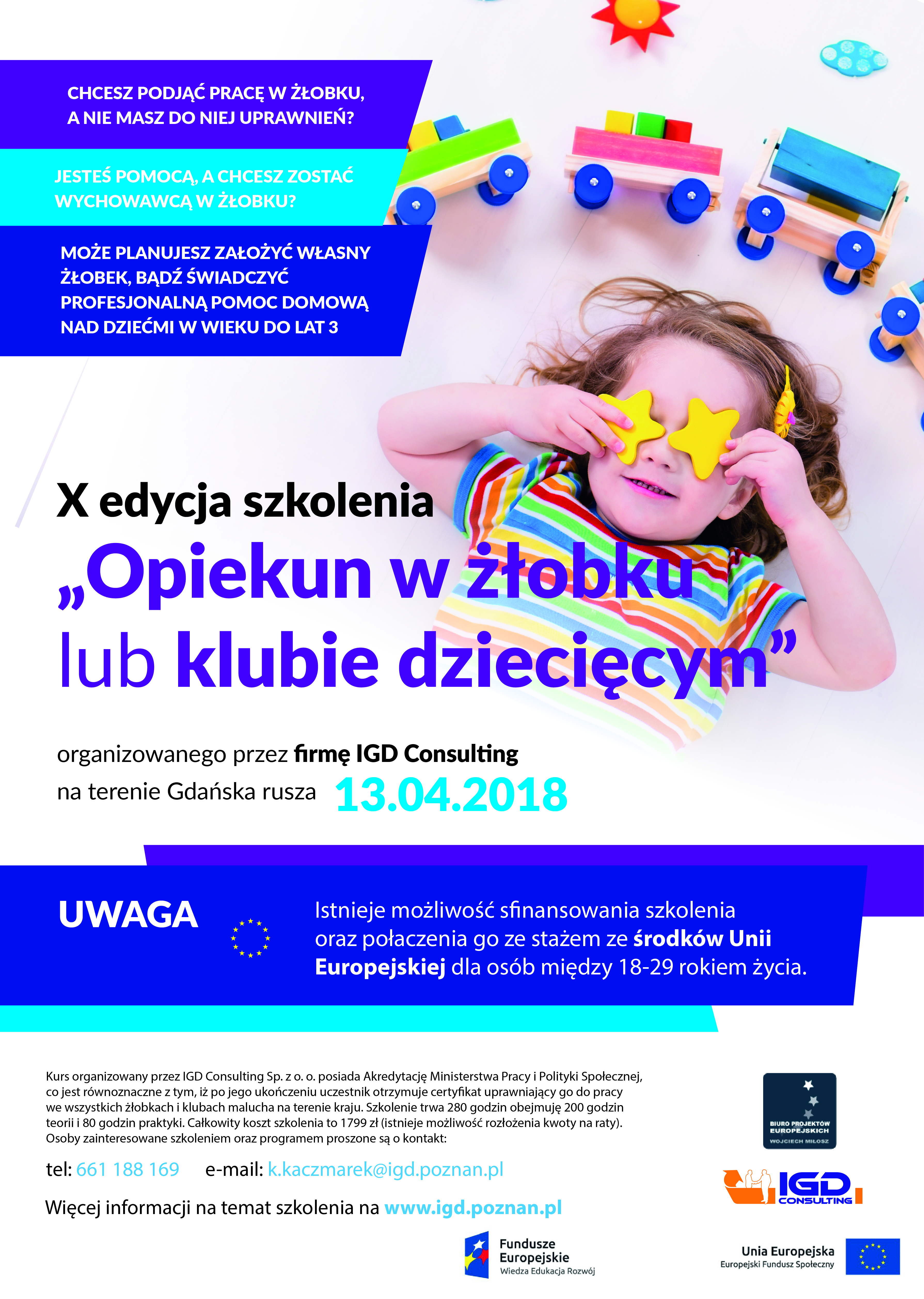 Zapraszamy do udziału w programie stażu połączonego ze szkoleniem „Opiekun w żłobku lub klubie dziecięcym”