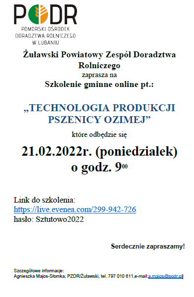 Strona główna » Aktualności » TECHNOLOGIA PRODUKCJI PSZENICY OZIMEJ Data dodania 18.02.2022 TECHNOLOGIA PRODUKCJI PSZENICY OZIMEJ Żuławski Powiatowy Zespół Doradztwa Rolniczego zaprasza na Szkolenie gminne online pt.: „TECHNOLOGIA PRODUKCJI PSZENICY OZIMEJ”, które odbędzie się 21.02.2022 r. (poniedziałek) o godz. 9:00 Link do szkolenia: https://live.evenea.com/299-942-726 hasło: Sztutowo2022 Serdecznie zapraszamy! Szczegółowe informacje: Agnieszka Majos-Słomka, PZDR/Żuławski, tel. 797 010 611,e-mail:a.majos@podr.pl Drukuj