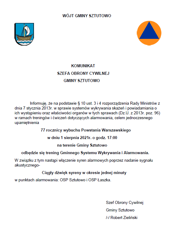 w dniu 1 sierpnia 2021 r. o godz. 17:00 na terenie Gminy Sztutowo odbędzie się trening Gminnego Systemu Wykrywania i Alarmowania.