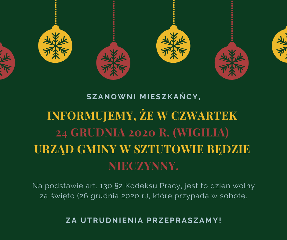 Strona główna » Aktualności » Urząd nieczynny 24 grudnia 2020 r. Data dodania 14.12.2020 Urząd nieczynny 24 grudnia 2020 r. Szanowni Mieszkańcy, informujemy, że w czwartek 24 grudnia 2020 r. (Wigilia) Urząd Gminy w Sztutowie będzie nieczynny. Na podstawie art. 130 §2 Kodeksu Pracy, jest to dzień wolny za święto (26 grudnia 2020 r.), które przypada w sobotę. Za utrudnienia przepraszamy! Drukuj