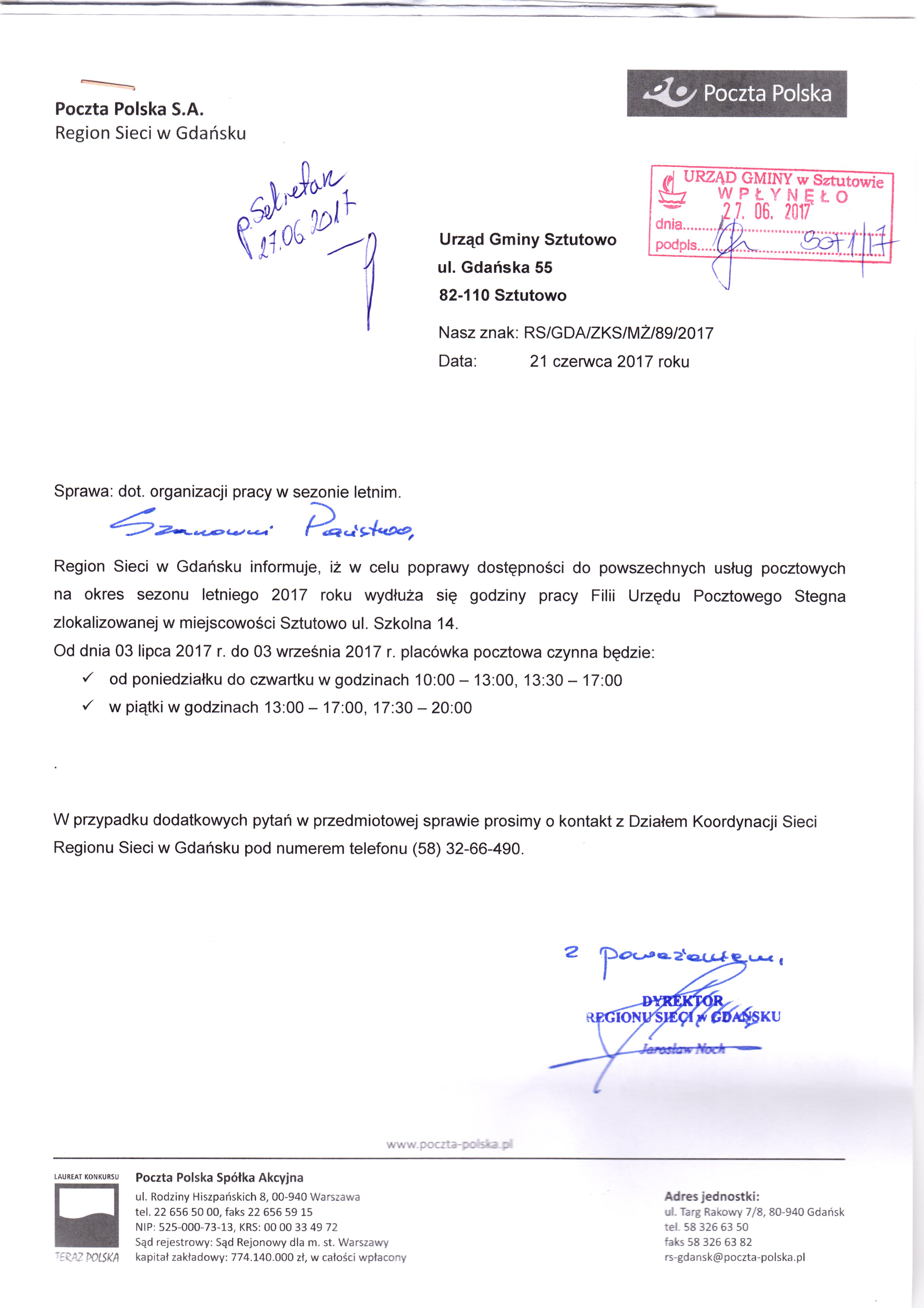 Strona główna » Aktualności » Urząd Pocztowy w Sztutowie godziny otwracia w sezonie Data dodania 29.06.2017 Urząd Pocztowy w Sztutowie godziny otwracia w sezonie Drukuj