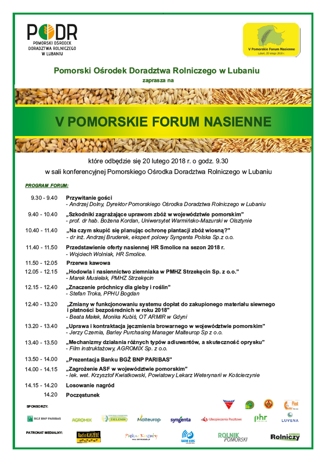 Pomorski Ośrodek Doradztwa Rolniczego w Lubaniu zaprasza na V Pomorskie Forum nasienne, które odbędzie się 20 lutego br. o godzinie 9:30 w sali konferencyjnej Pomorskiego Ośrodka Doradztwa Rolniczego w Lubaniu. Szczegóły na plakacie: