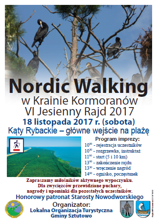Lokalna Organizacja Turystyczna zaprasza na VI Jesienny Rajd 2017 – Nordic Walking w Krainie Kormoranów, który odbędzie się 18 listopada br (sobota). Początek imprezy o godzinie 10:00 przy głównym wejściu na plażę w Kątach Rybackich. Szczegóły w rozwinięciu.