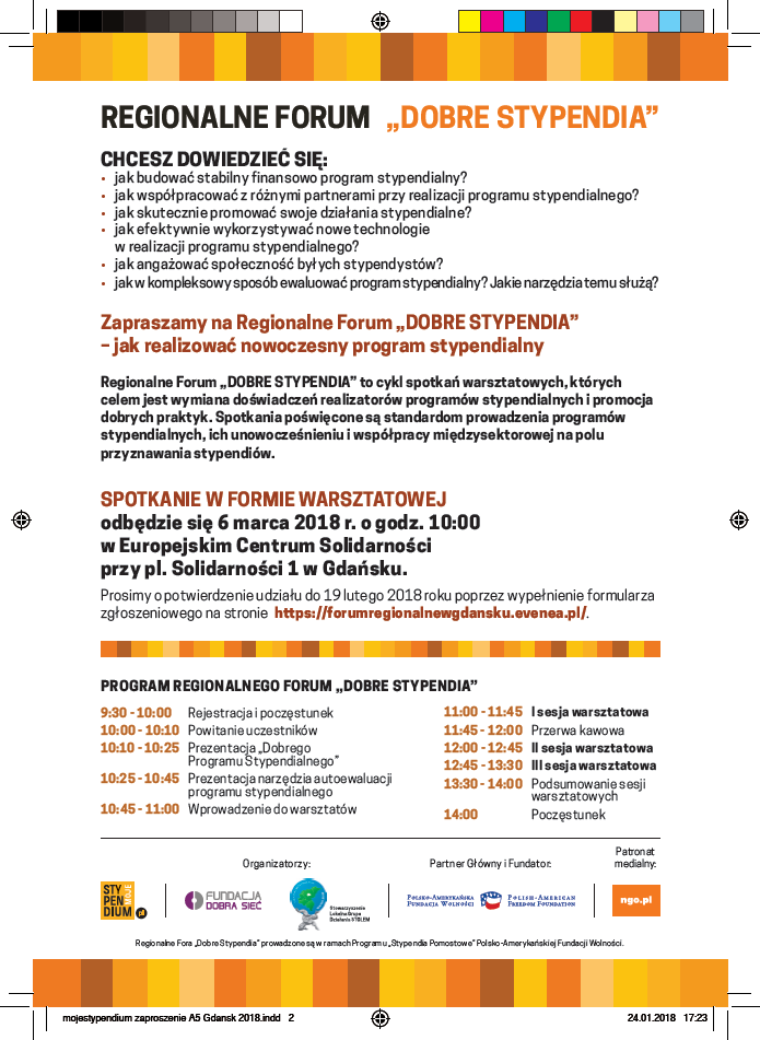 Fundacja Dobra Sieć zaprasza na Regionalne Forum „Dobre Stypendia”. Spotkanie w formie warsztatowej odbędzie się 6 marca 2018 r. o godz. 10:00 w Europejskim Centrum Solidarności, przy pl. Solidarności 1 w Gdańsku.