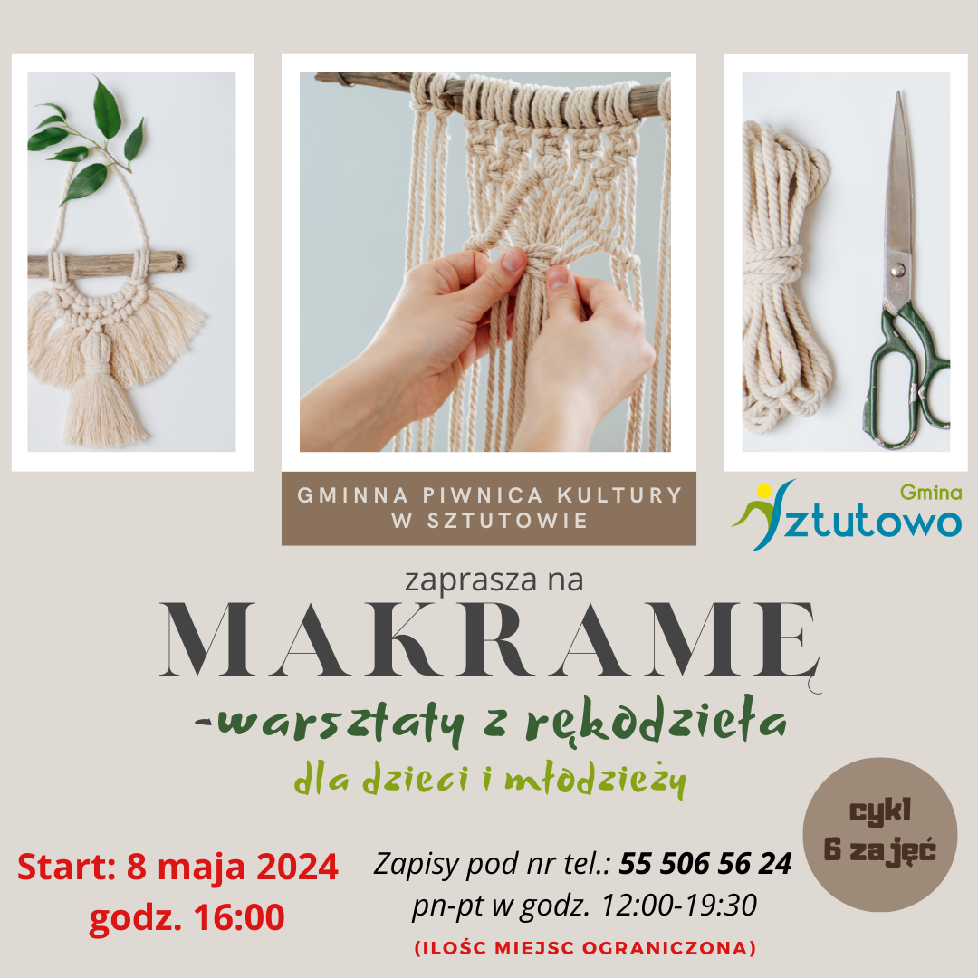 Warsztaty z makramy ruszają już 8 maja br. o gdz. 16:00 i będą odbywać się w każdą środę (ilość spotkań: 6)