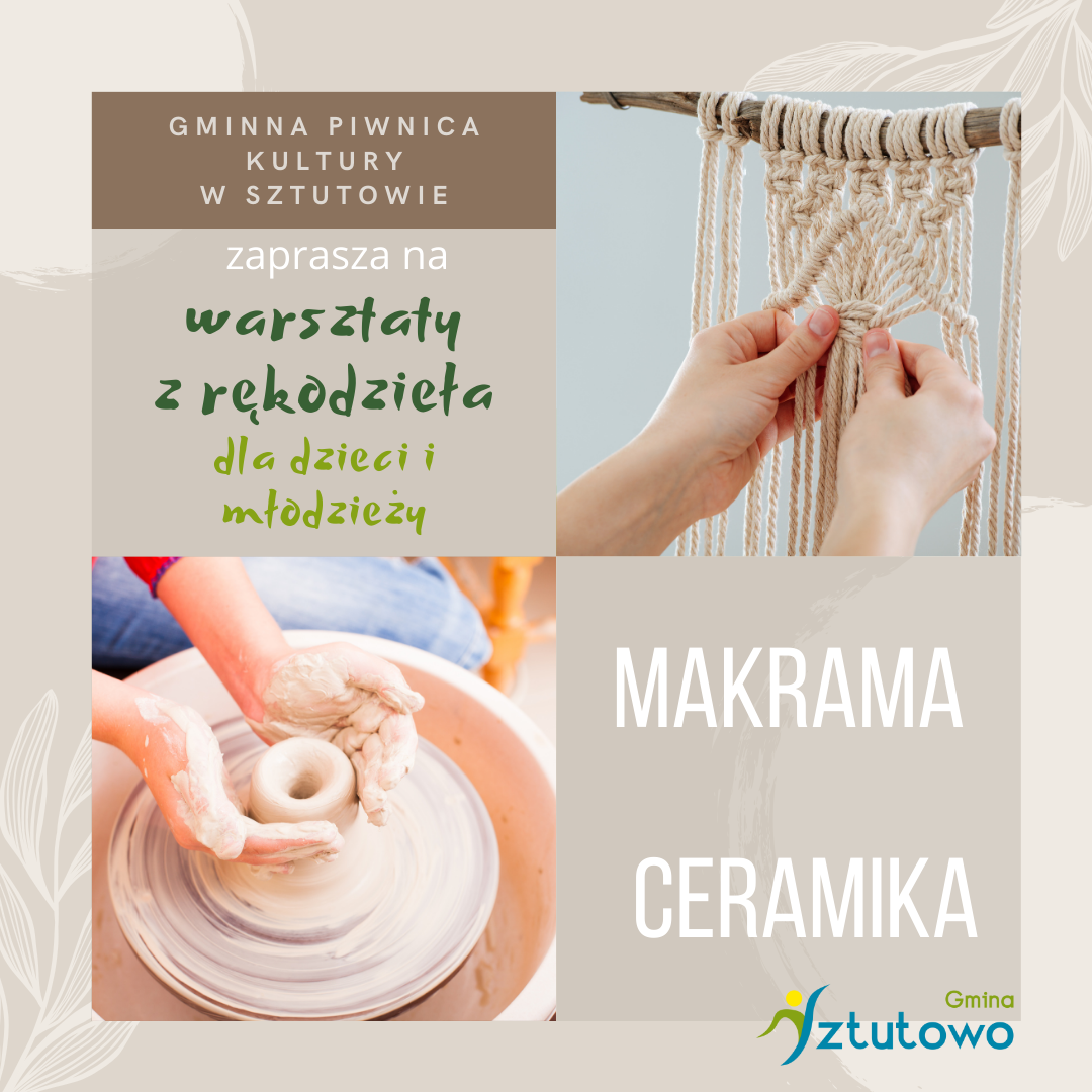 W Gminnej Piwnicy Kultury ruszają zapisy na warsztaty z ceramiki i makramy. Zapraszamy chętne dzieci i młodzież do zapisów. Pamiętajmy, że liczba miejsc jest ograniczona.