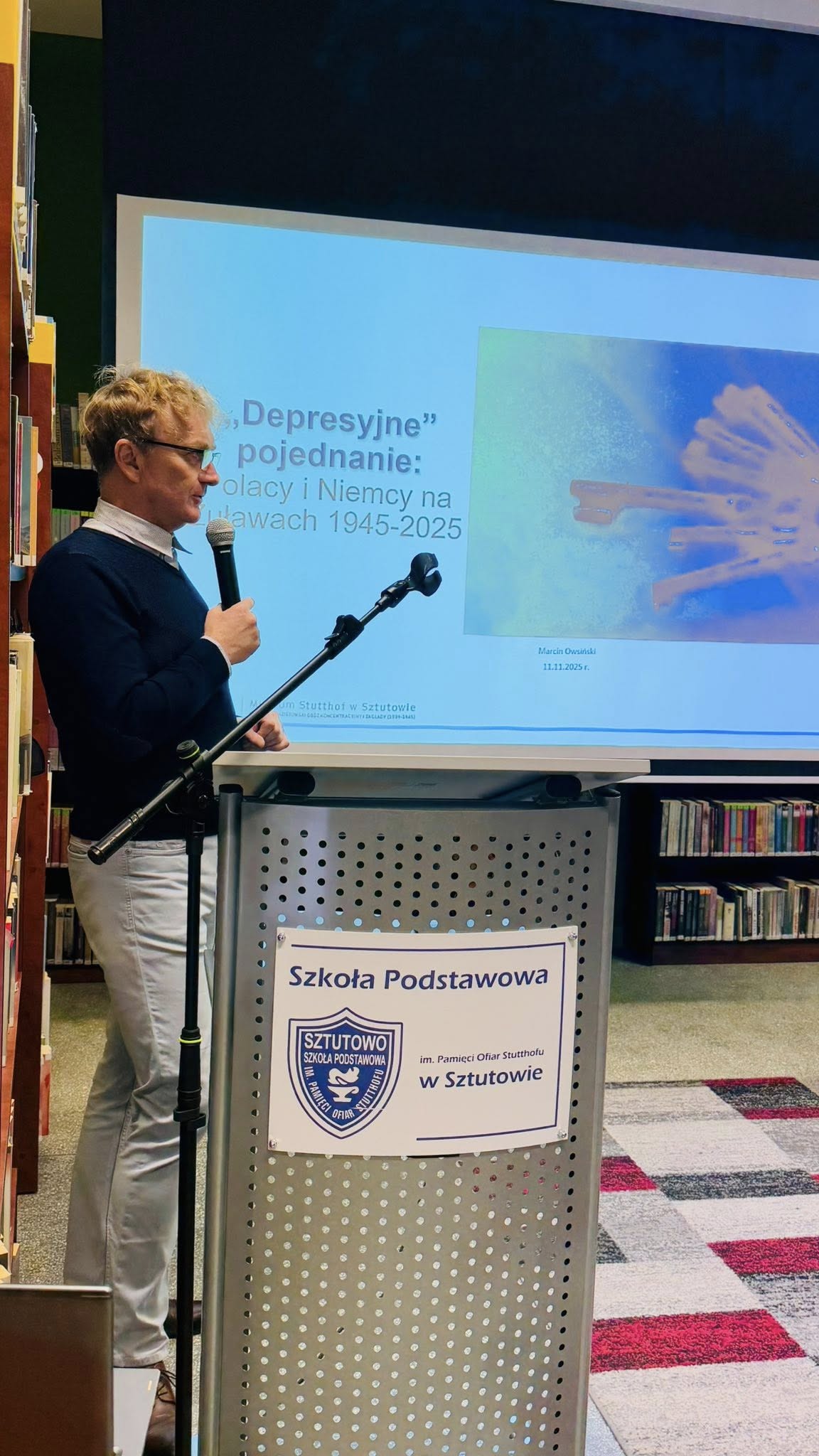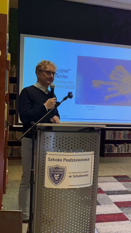 Spotkanie rozpoczął występ grupy wokalnej z Piwnica Kultury, która wprowadziła nas w patriotyczny wieczorny nastrój. Pierwszym autorem spotkania był dr hab. Marcin Owsiński, który przedstawił prezentację pt. „Depresyjne pojednanie: Polacy i Niemcy na Żuławach 1945–2025”, która w niezwykle interesujący sposób ukazała procesy przemian, pamięci i wspólnego dziedzictwa naszego regionu na przestrzeni 80 lat.