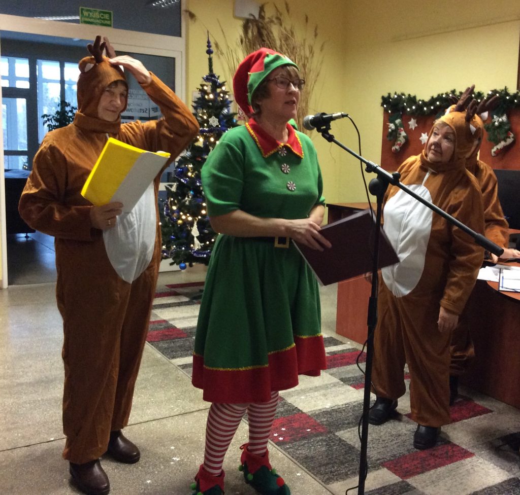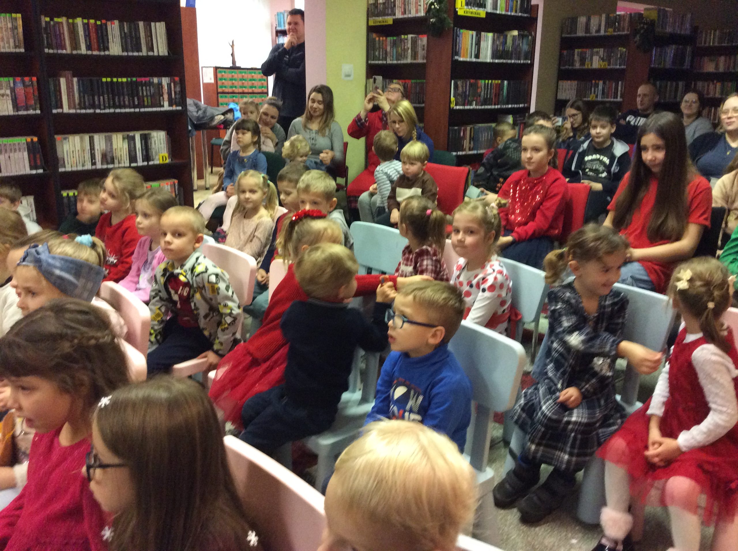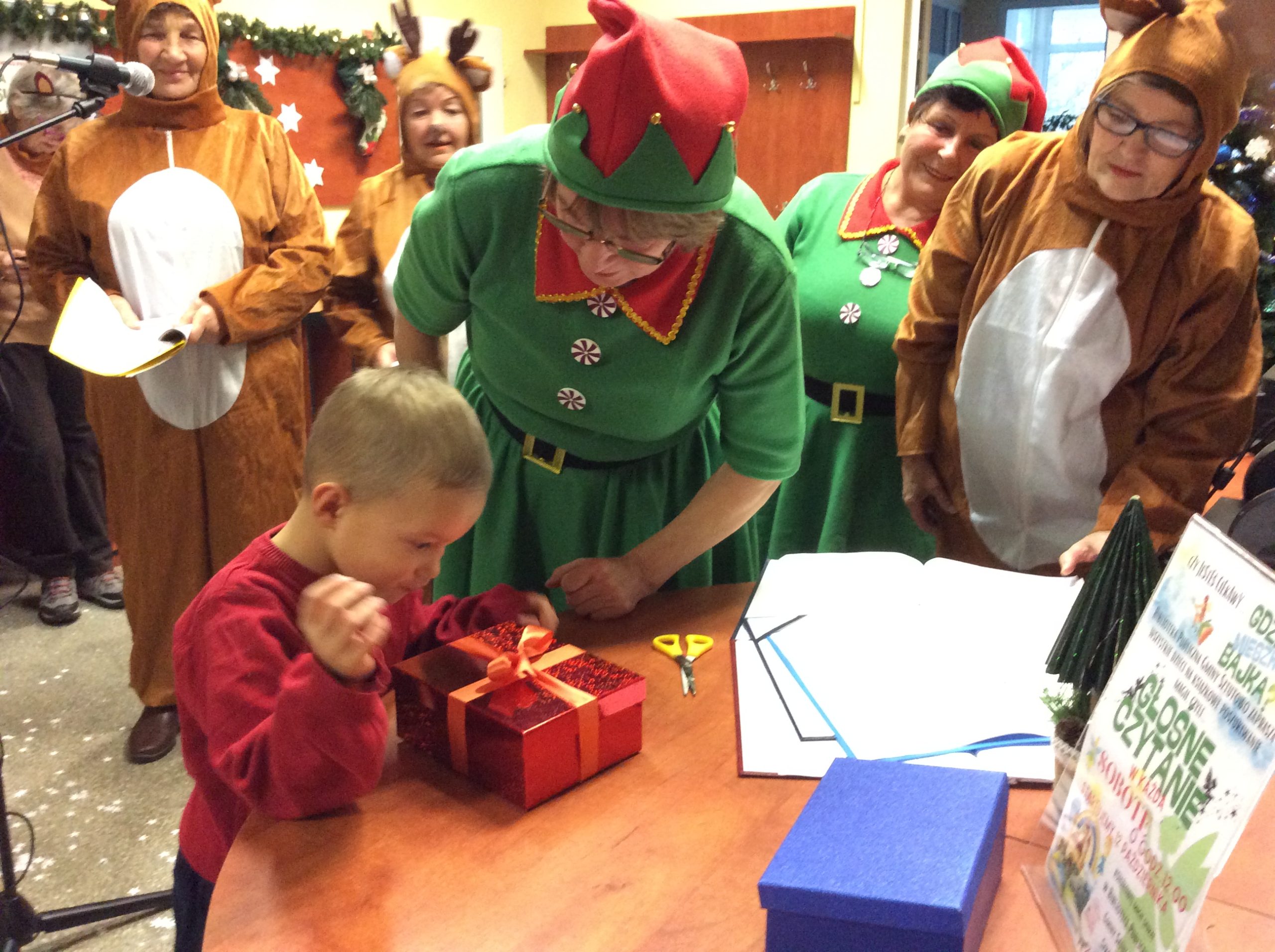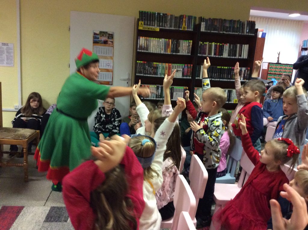 Zanim jednak przybył Mikołaj… na scenę zawitał iście bożonarodzeniowy duch świąt. Reniferki, skrzaty, dzwonki, zimowe piosenki i licznie zgromadzeni najmłodsi nasi czytelnicy, z wypiekami na twarzach, podziwiający to nasze biblioteczne show. Śmiechu było co niemiara. Wielki finał stanowiło wspólne wywołanie spóźnionego Mikołaja (dlaczego Mikołaj się spóźnił wiedzą tyko Ci, którzy uczestniczyli w przedstawieniu).