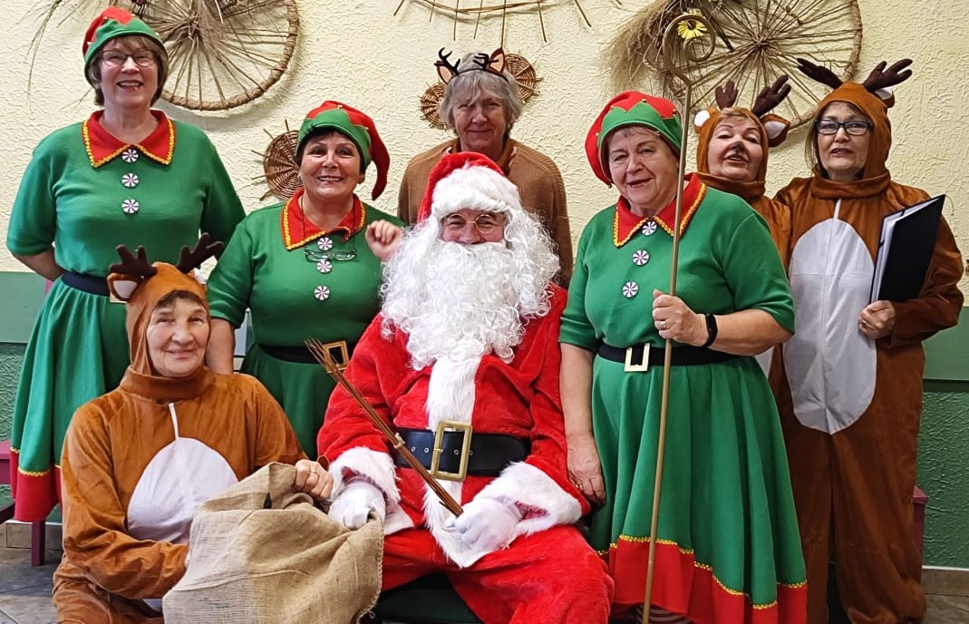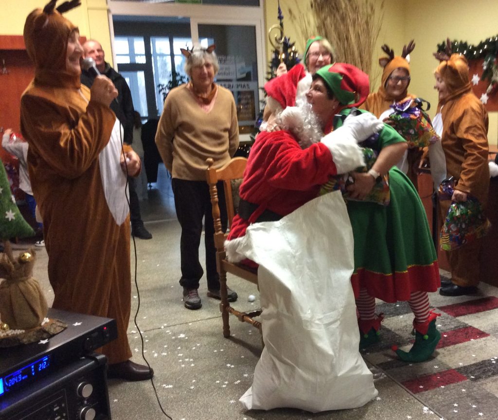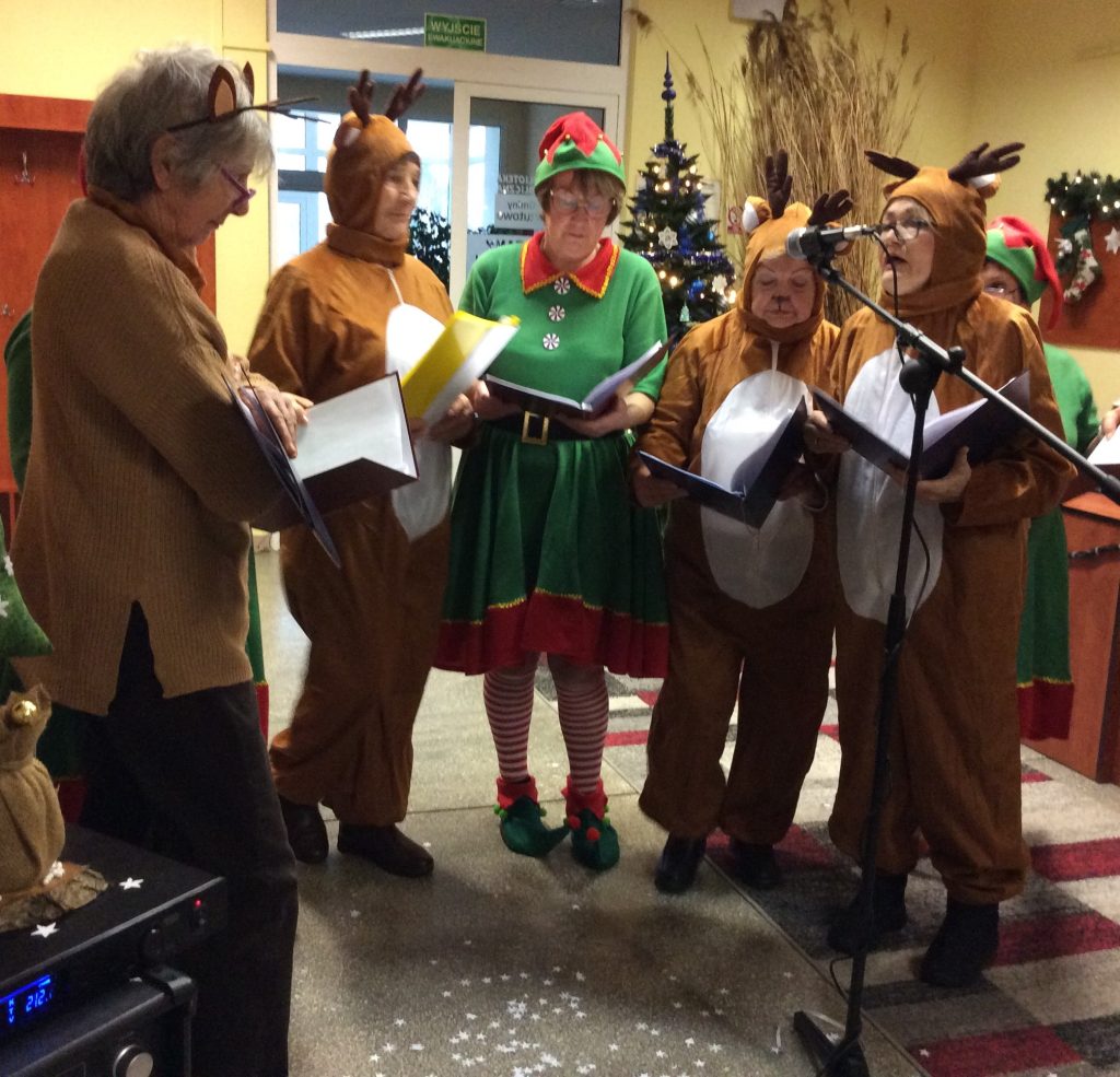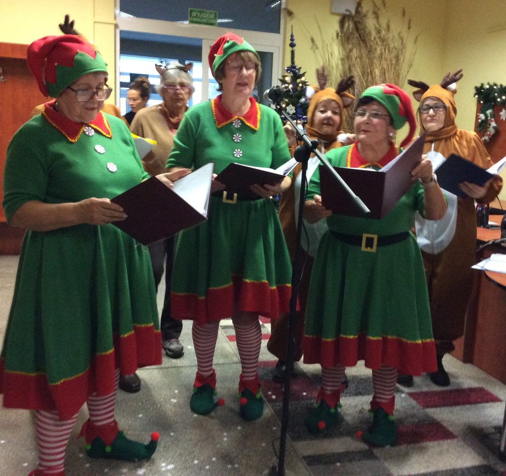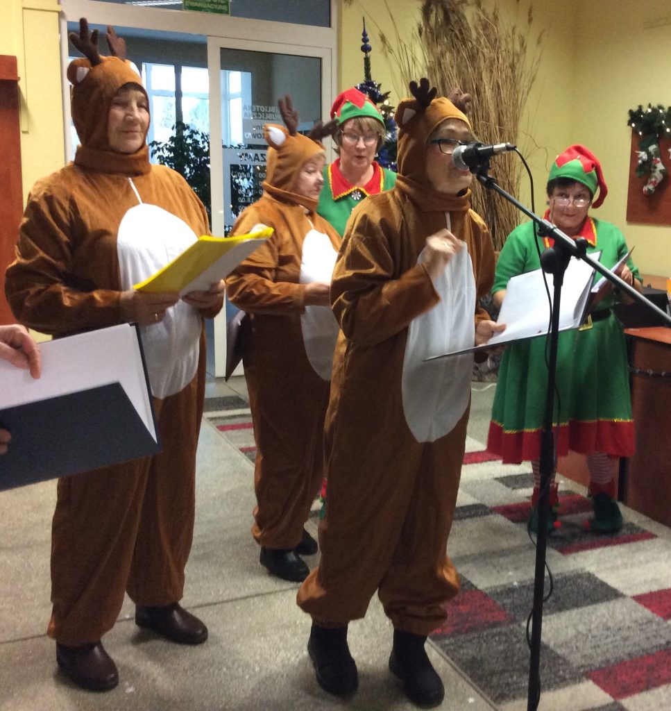 Zanim jednak przybył Mikołaj… na scenę zawitał iście bożonarodzeniowy duch świąt. Reniferki, skrzaty, dzwonki, zimowe piosenki i licznie zgromadzeni najmłodsi nasi czytelnicy, z wypiekami na twarzach, podziwiający to nasze biblioteczne show. Śmiechu było co niemiara. Wielki finał stanowiło wspólne wywołanie spóźnionego Mikołaja (dlaczego Mikołaj się spóźnił wiedzą tyko Ci, którzy uczestniczyli w przedstawieniu).