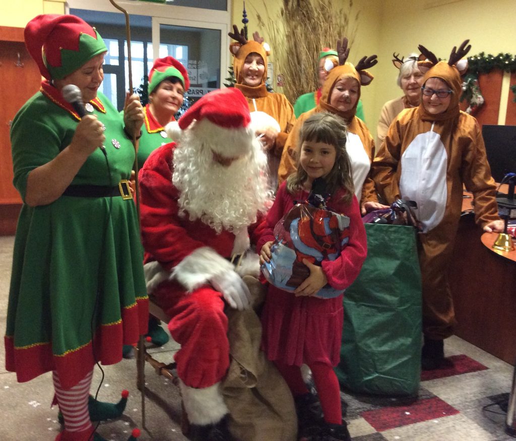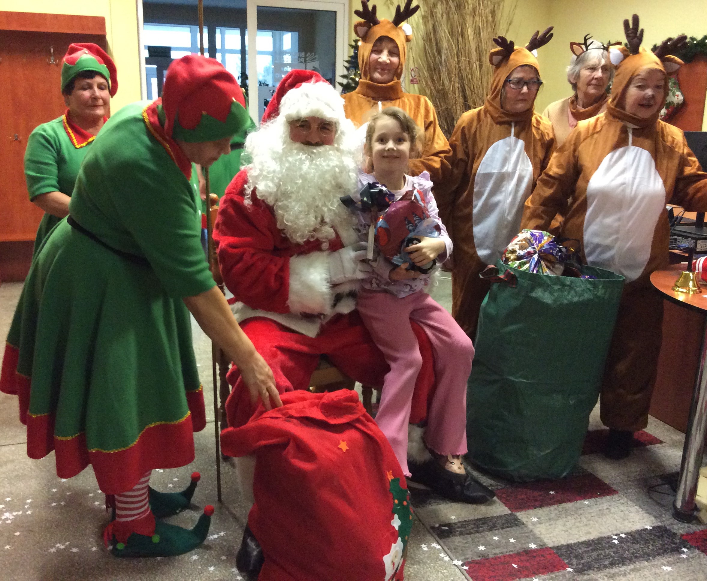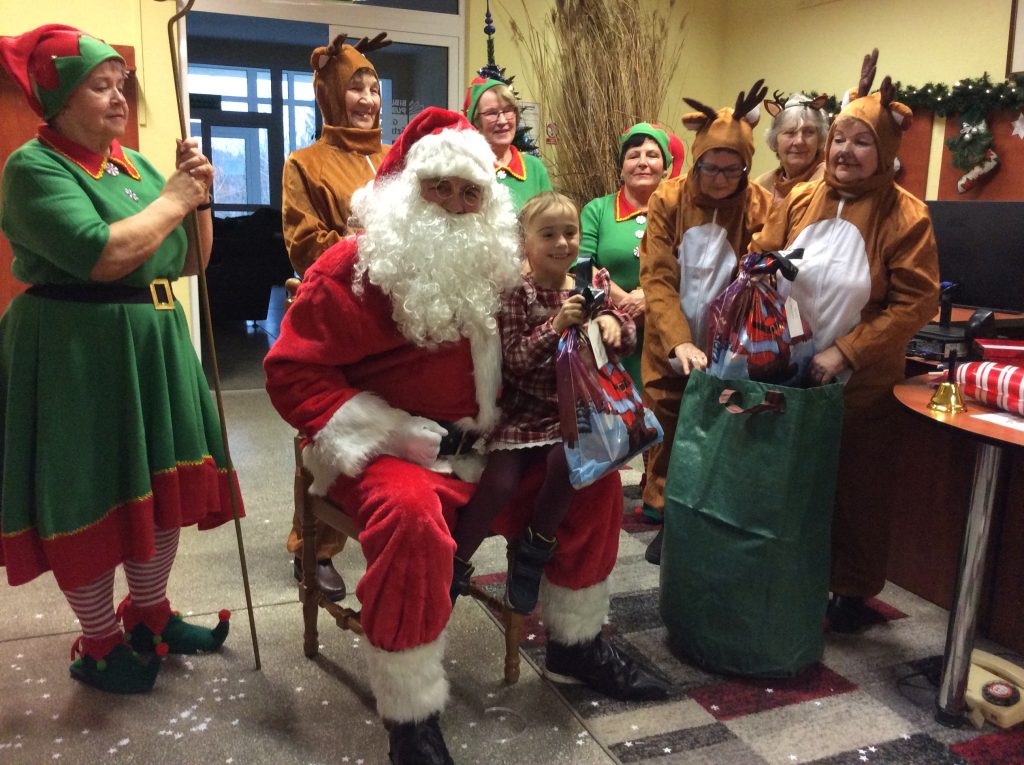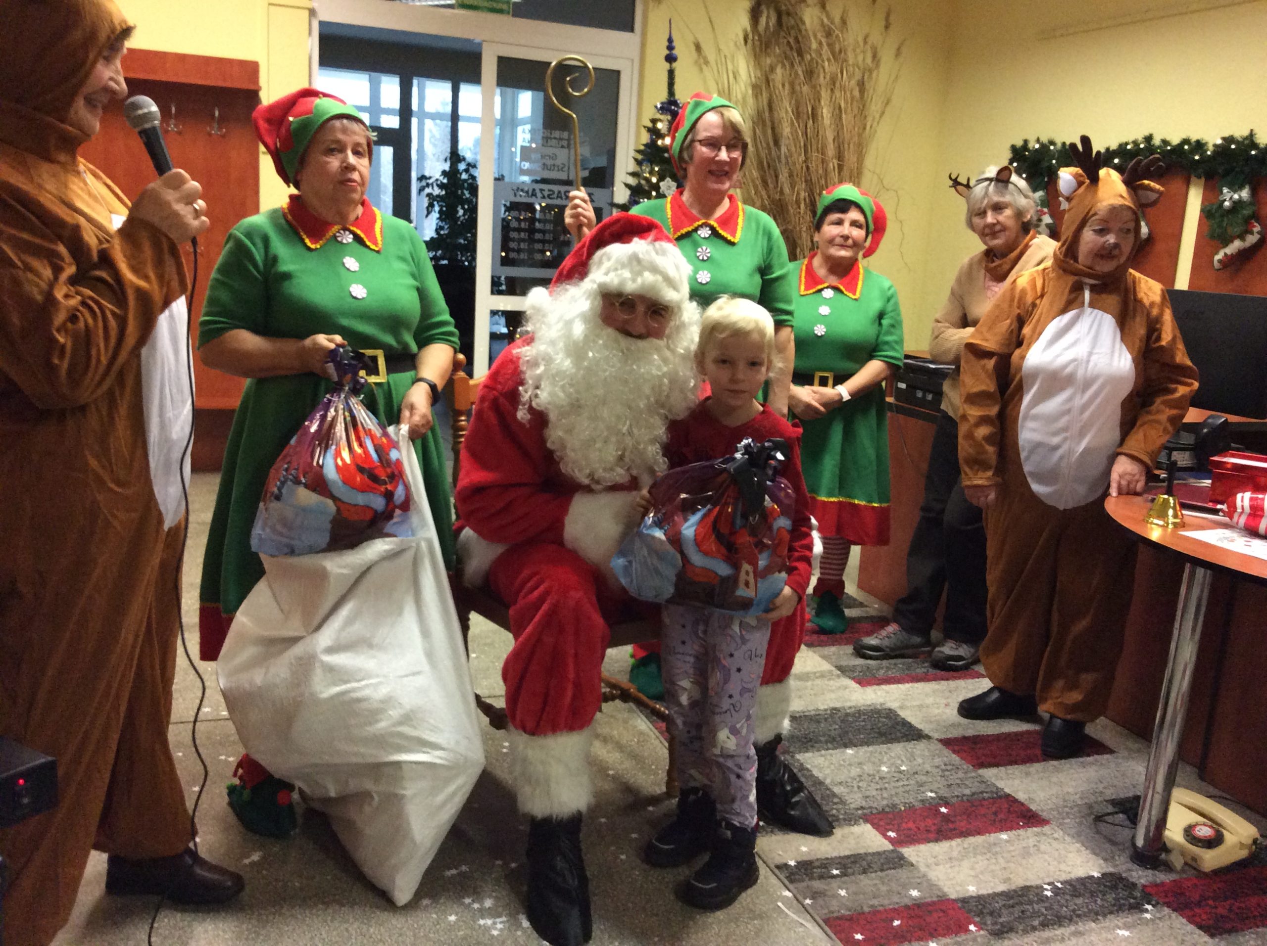Kiedy już Mikołaj dotarł do biblioteki, skrzaty i renifery pomogły wtaszczyć olbrzymie wory pełne prezentów, każde z zaproszonych dzieci odebrało swój prezent i mogło zapozować do zdjęcia z Mikołajem – urocza pamiątka na lata.
