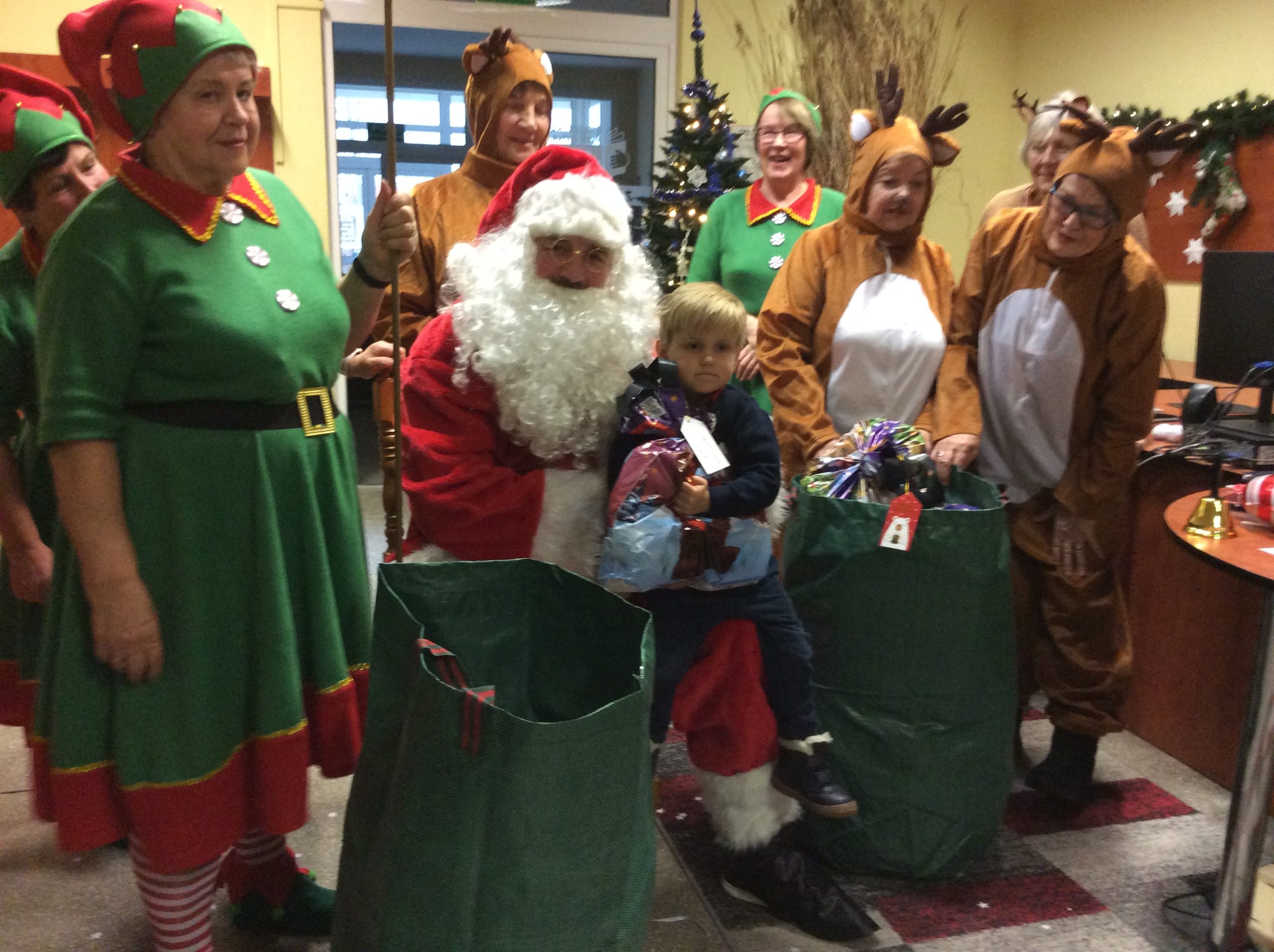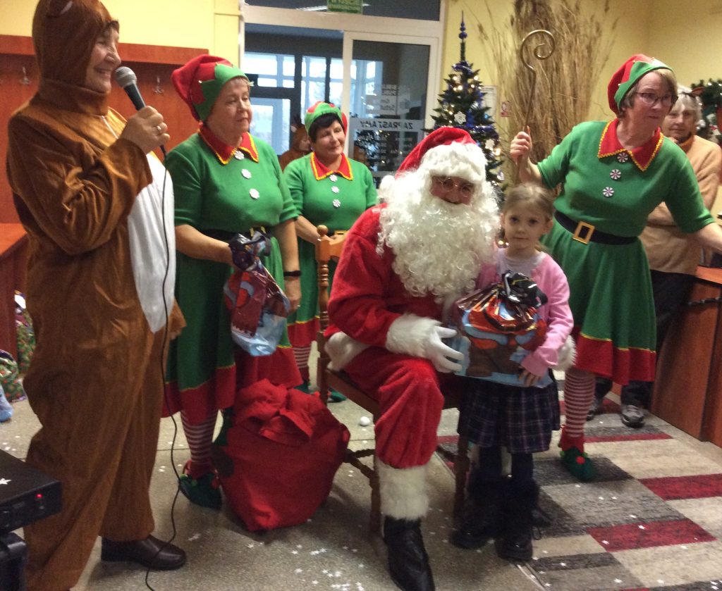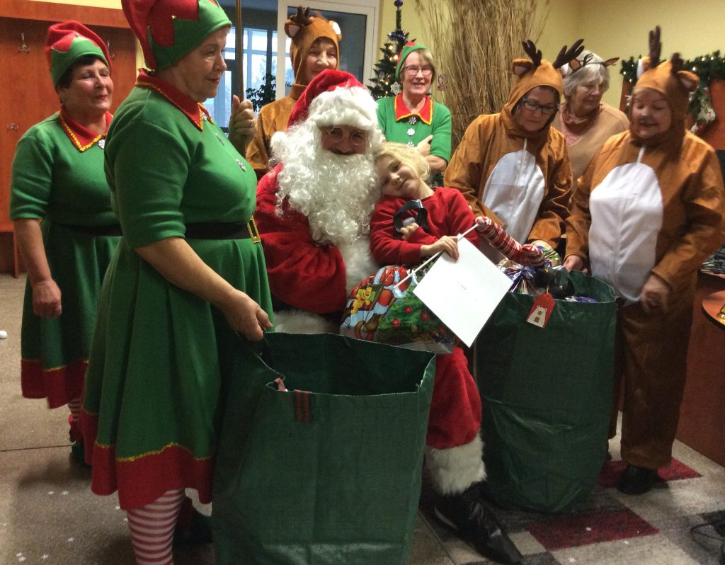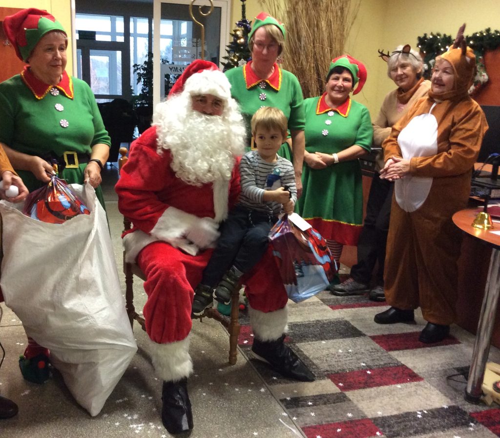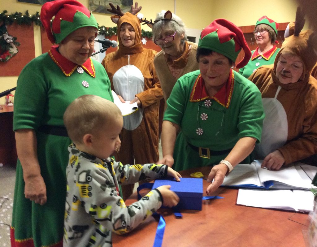 Kiedy już Mikołaj dotarł do biblioteki, skrzaty i renifery pomogły wtaszczyć olbrzymie wory pełne prezentów, każde z zaproszonych dzieci odebrało swój prezent i mogło zapozować do zdjęcia z Mikołajem – urocza pamiątka na lata.