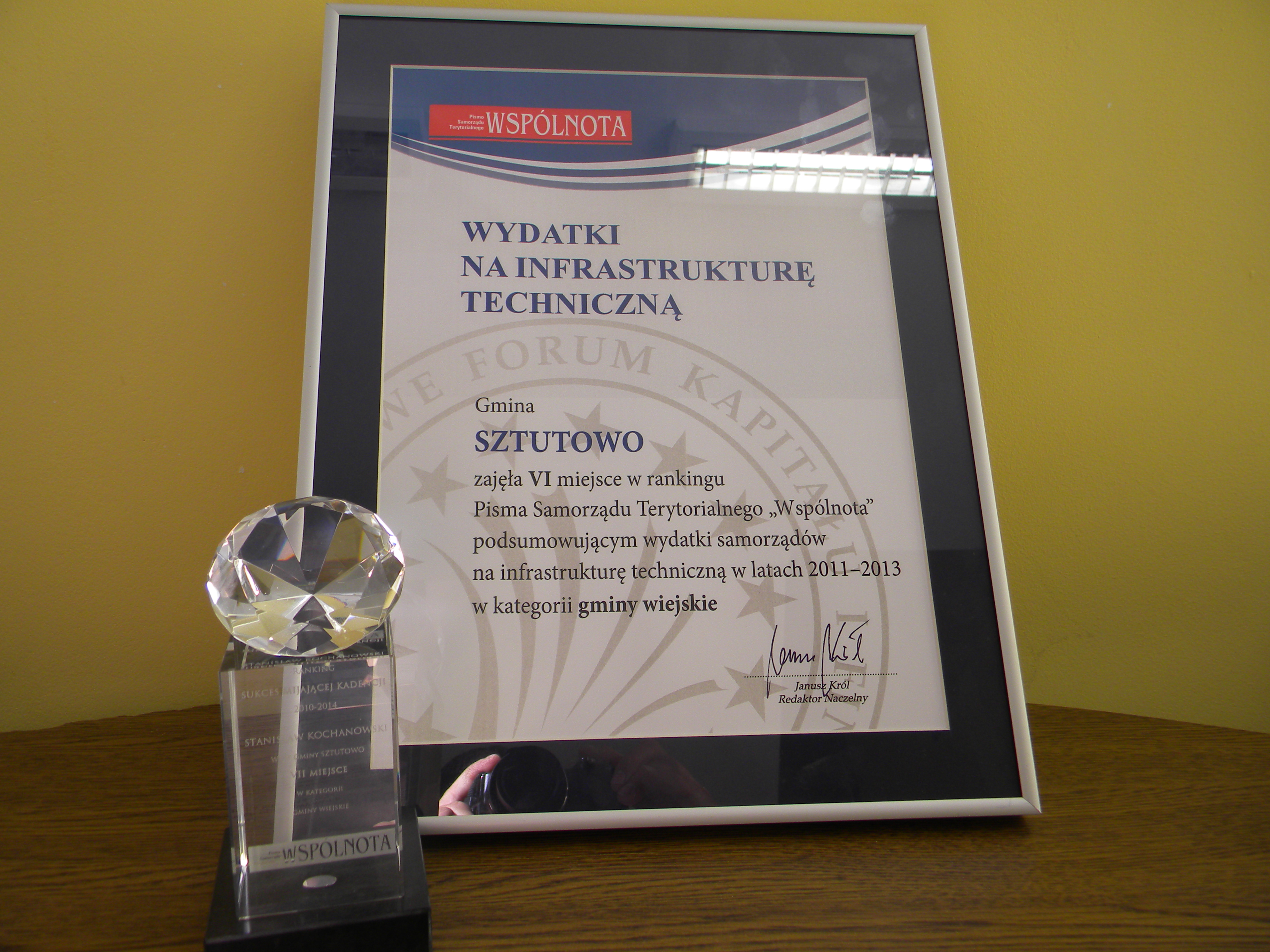 Wójt Stanisław Kochanowski w dniu 01.10.2014 r. odebrał prestiżowe nagrody dla Gminy Sztutowo, które zostały przyznane przez ogólnopolskie Pismo Samorządu Terytorialnego WSPÓLNOTA. W kategorii Sukces Kadencji Gmina Sztutowo zajęła 7 miejsce, natomiast w kategorii Inwestycje w Infrastrukturę Techniczną 6 miejsce. Ranking obejmował 1576 gmin wiejskich.