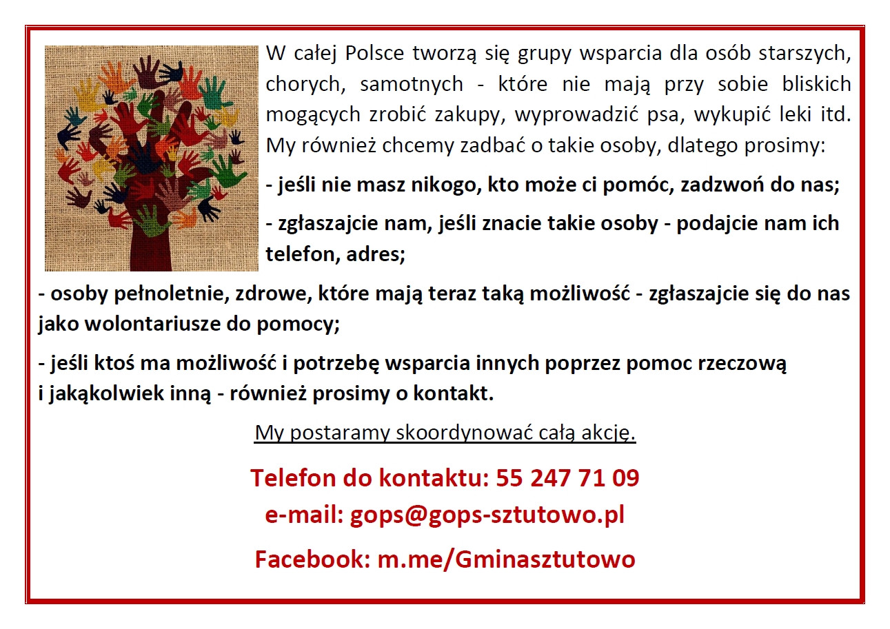 Strona główna » Aktualności » Wsparcie dla potrzebujących Data dodania 16.03.2020 Wsparcie dla potrzebujących Drukuj
