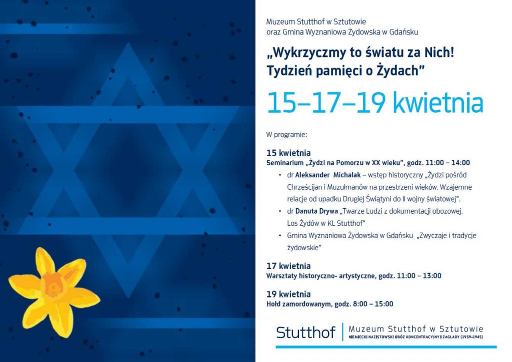 um Stutthof w Sztutowie oraz Gmina Wyznaniowa Żydowska w Gdańsku zaprasza do udziału w wydarzeniu „Wykrzyczmy to światu za Nich! Tydzień pamięci o Żydach”, które odbędzie się w dniach 15-17-19 kwietnia w Muzeum Stutthof w Sztutowie. Seminarium „Żydzi na Pomorzu w XX wieku” dedykowane jest osobom dorosłym zainteresowanym tematyką. Dzieci i młodzież zapraszamy na warsztaty artystyczne. Osoby zainteresowane prosimy o zgłaszania chęci udziału pod adresem edukacja@stutthof.org.