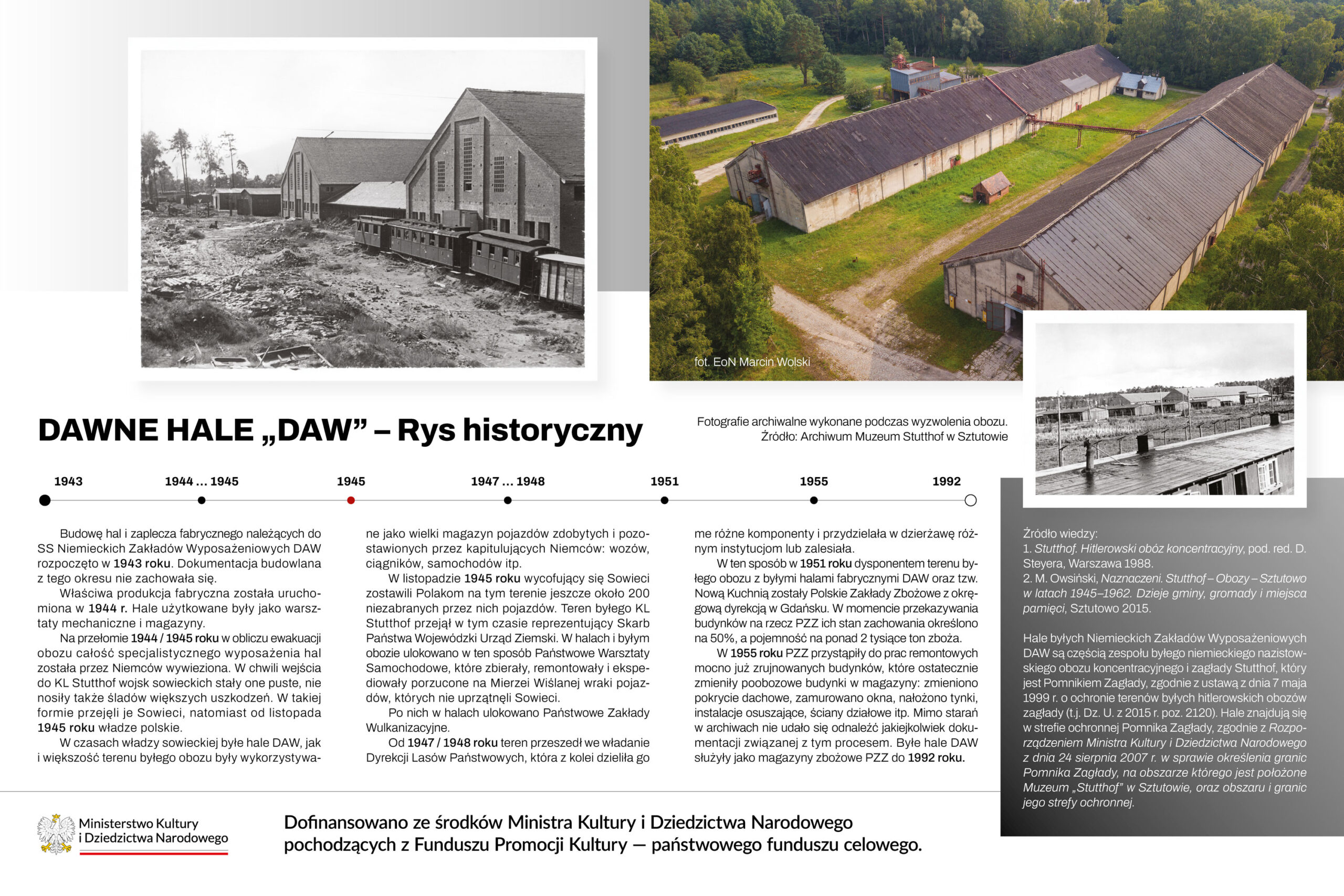 Opis zadania: wykonanie dokumentacji projektowej rekonstrukcji dachu dla budynku hali północnej byłych Niemieckich Zakładów Zbrojeniowych DAW, zabytku znajdującego się w strefie ochronnej Pomnika Zagłady, na obszarze którego jest położone Muzeum Stutthof w Sztutowie. Wykonana dokumentacja techniczna będzie podstawą do ratowania zabytku, którego dach z powodu złego stanu technicznego będzie w tym roku zdemontowany. Będzie też podstawą do wyceny prac koniecznych do wykonania. Dokumentacja projektowa da podstawę do starania się o dalsze dotacje. Planujemy także wykonanie i ustawienie tablicy informacyjnej informującej o ważnej historii tego miejsca, a także wymianę części ogrodzenia zabezpieczającego to miejsce z uwagi na jego zły stan techniczny.