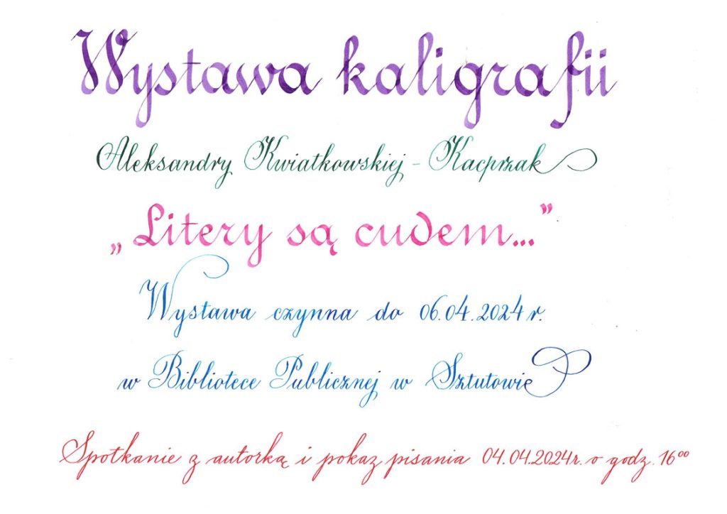 Zapraszamy na wystawę kaligrafii Aleksandry Kwiatkowskiej-Kacprzak pt. „Litery są cudem…”