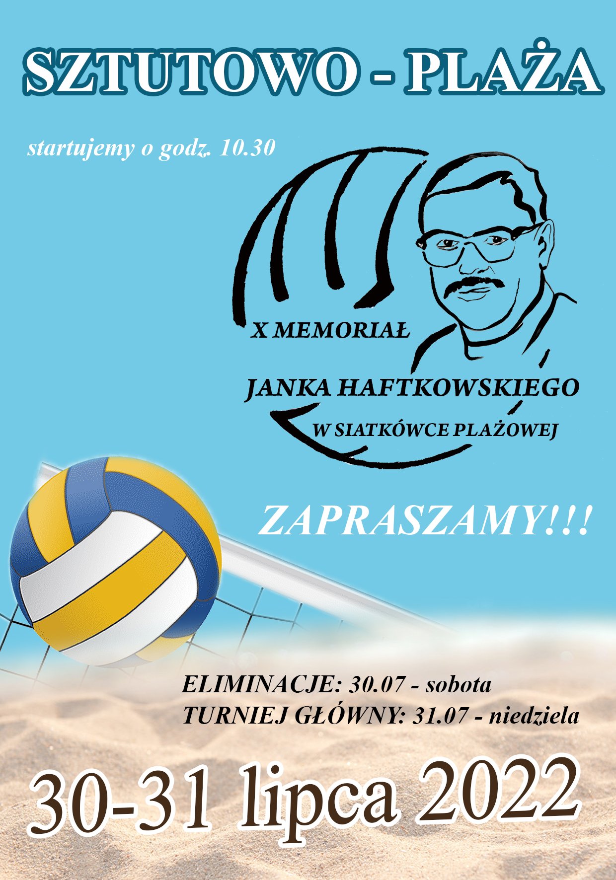 Już za chwileczkę, już za momencik odbędzie się jubileuszowy X Memoriał Janka Haftkowskiego w siatkówce plażowej. W tym roku gramy przez 2 dni w sobotę (30.07) i niedzielę (31.07). Zapraszamy wszystkich siatkarzy bardzo serdecznie na naszą sztutowską Copacabanę. Będzie o co grać bo pula nagród to 8000 PLN