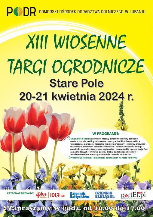 Strona główna » Aktualności » XIII Wiosenne Targi Ogrodnicze w Starym Polu! Data dodania 08.04.2024 XIII Wiosenne Targi Ogrodnicze w Starym Polu! W imieniu Pomorskiego Ośrodka Doradztwa Rolniczego serdecznie zapraszamy na XIII Wiosenne Targi Ogrodnicze, które odbędą się 20 i 21 kwietnia 2024 r. w Starym Polu. Drukuj