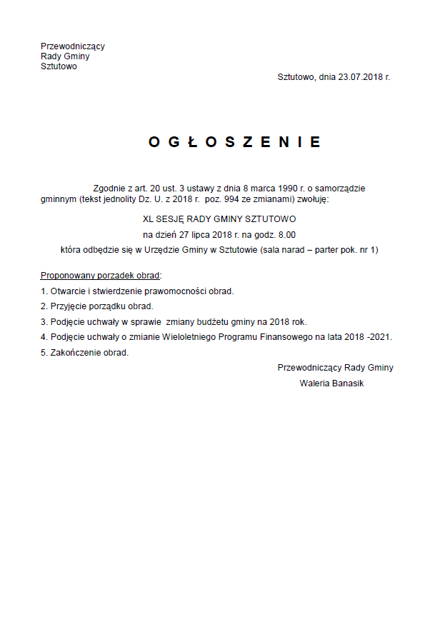 Strona główna » Aktualności » XL Sesja Rady Gminy Sztutowo – 27.07.2018 r. Data dodania 24.07.2018 XL Sesja Rady Gminy Sztutowo – 27.07.2018 r. Drukuj