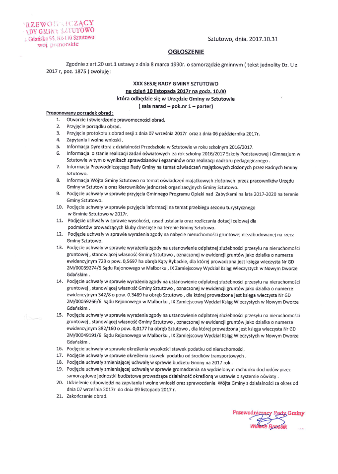 Strona główna » Aktualności » XXX Sesja Rady Gminy Sztutowo Data dodania 08.11.2017 XXX Sesja Rady Gminy Sztutowo Urząd Gminy w Sztutowie informuje, że 10 listopada br. o godzinie 10:00 w sali narad odbędzie się XXX Sesja Rady Gminy Sztutowo.Szczegóły obrad poniżej: Drukuj