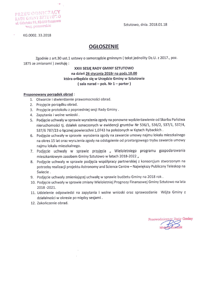 Strona główna » Aktualności » XXXIII Sesja Rady Gminy Sztutowo – 26.01.2018 r. Data dodania 18.01.2018 XXXIII Sesja Rady Gminy Sztutowo – 26.01.2018 r. Urząd Gminy w Sztutowie informuje, że 26 stycznia br. o godzinie 10:00 w sali narad odbędzie się XXXIII Sesja Rady Gminy Sztutowo. Szczegóły w rozwinięciu. Drukuj
