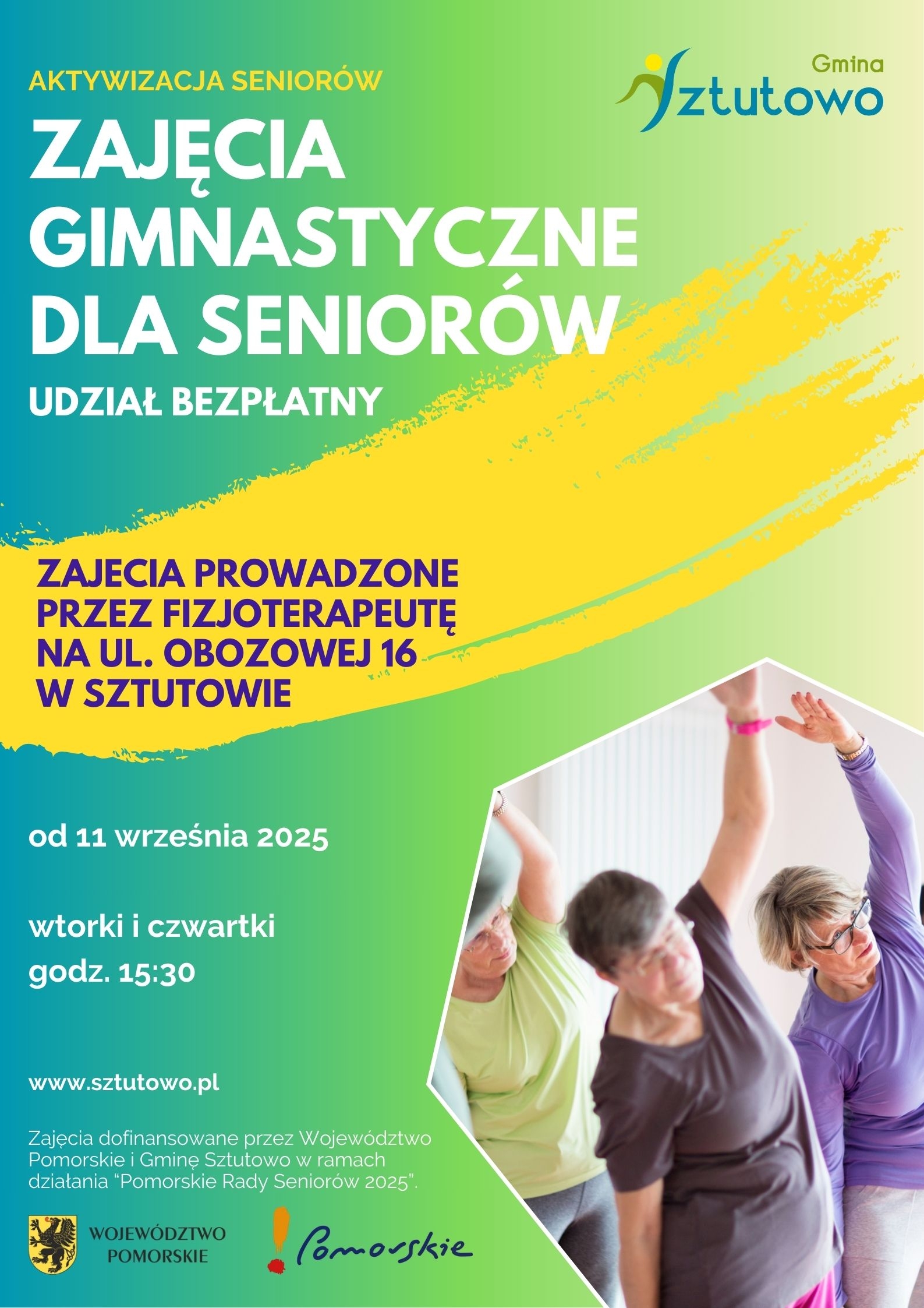 Przypominamy, że 11 września br. rozpoczęły się zajęcia ruchowe dla seniorów, w ramach projektu „Chodźmy razem po zdrowie” – cykl zajęć aktywizujących ruchowo seniorów z Gminy Sztutowo – II edycja, który otrzymał dofinansowanie w wysokości 6 730,00 zł w ramach pomocy finansowej ze środków Województwa Pomorskiego pod nazwą: POMORSKIE RADY SENIORÓW 2025. Drugie tyle dokładamy z budżetu Gminy Sztutowo.