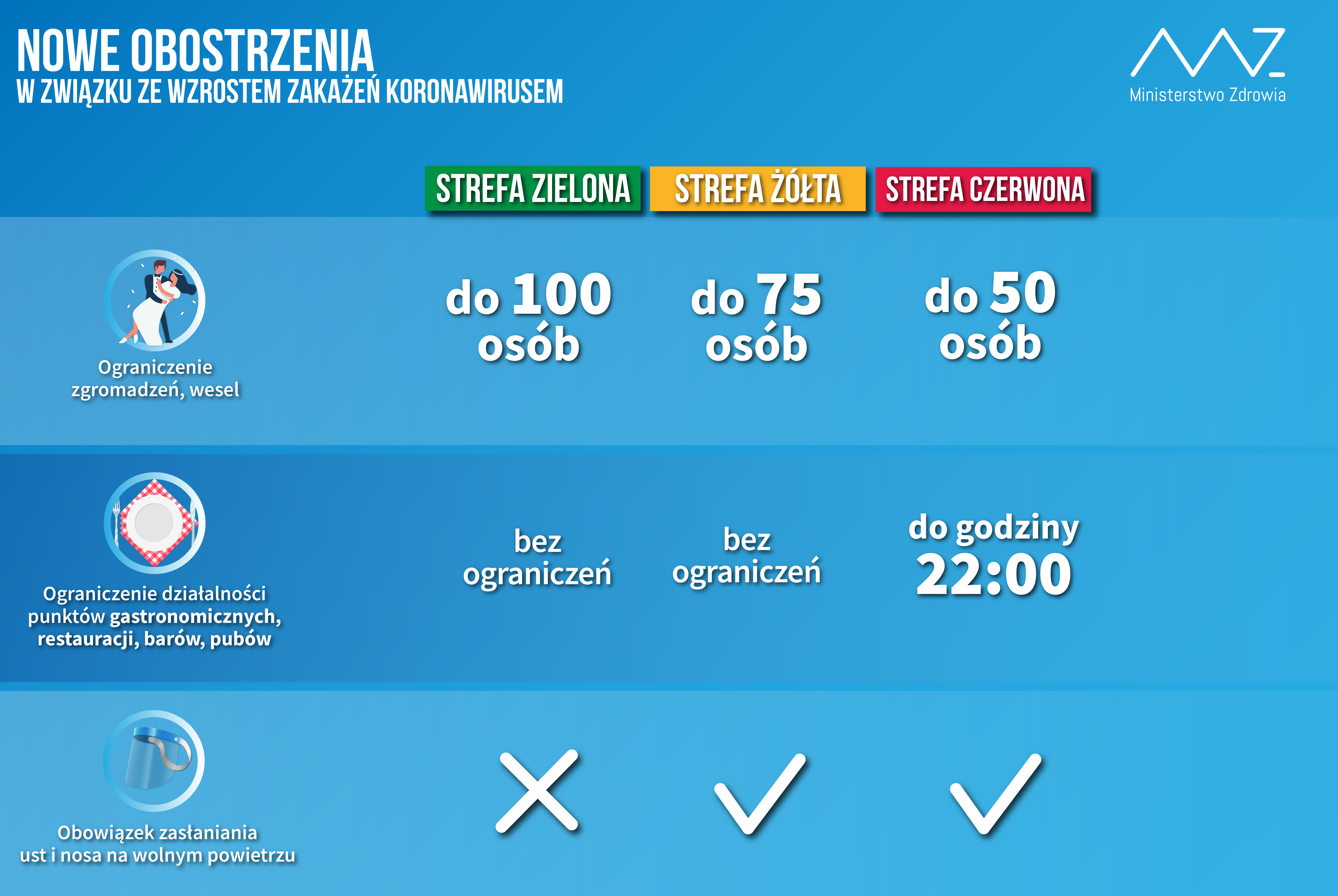 Od najbliższej soboty (10 października) obowiązują nowe zasady dla poszczególnych stref. W strefie czerwonej pojawi się nowe obostrzenie – ograniczenie działalności restauracji, pubów i barów do godziny 22.00. Obowiązek zasłaniania ust i nosa na wolnym powietrzu zostanie rozszerzony i będzie obowiązywał również w strefie żółtej, a nie jak do tej pory tylko w czerwonej.