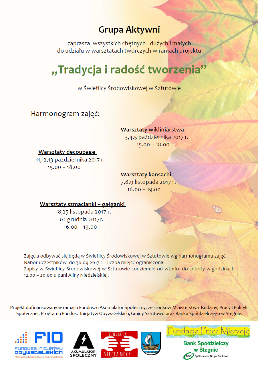Strona główna » Aktualności » Zapisy na warsztaty twórcze w Świetlicy Środowiskowej w Sztutowie Data dodania 13.09.2017 Zapisy na warsztaty twórcze w Świetlicy Środowiskowej w Sztutowie Drukuj
