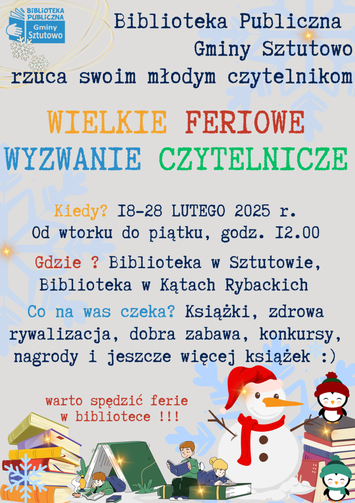 Strona główna » Aktualności » Zapraszamy na ferie w Bibliotekach Gminy Sztutowo Data dodania 10.02.2025 Zapraszamy na ferie w Bibliotekach Gminy Sztutowo Drukuj