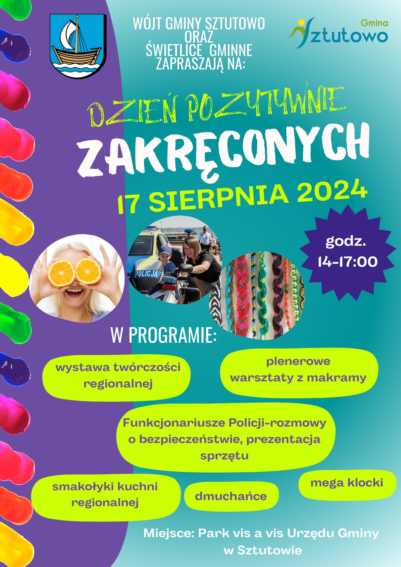 Natomiast od godz. 14:00 zapraszamy wszystkich do parku vis a vis Urzędu Gminy w Sztutowie, gdzie odbędzie się Dzień Pozytywnie Zakręconych. To wydarzenie na stałe wpisało się w harmonogram naszych wydarzeń letnich. Jest ono niesamowitą okazją do przedstawienia Wam naszych cudownych mieszkańców,