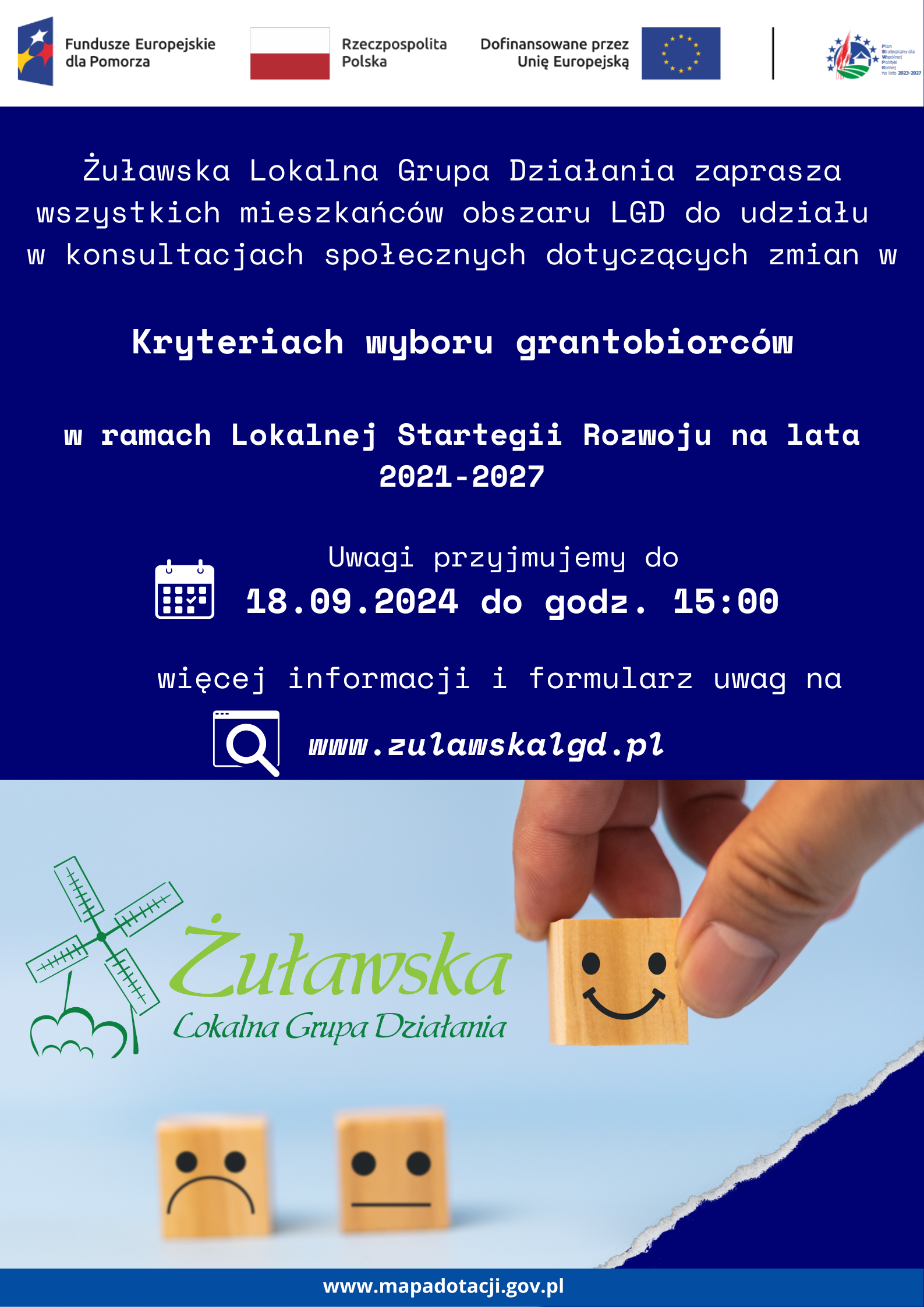 Żuławska Lokalna Grupa Działania zaprasza wszystkich mieszkańców obszaru LGD do udziału w konsultacjach społecznych dotyczących zmian w Kryteriach wyboru grantobiorców w ramach Lokalnej Strategii Rozwoju na lata 2021-2027.
